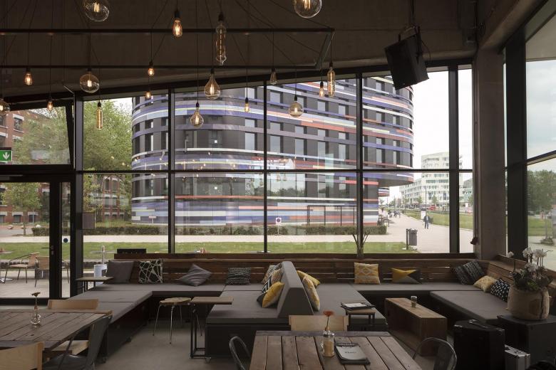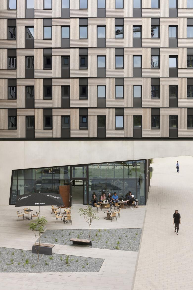 Nutzung und Funktionsverteilung des Wohnheims sind von außen deutlich ablesbar. Das Erdgeschoss und die drei Erschließungskerne sind in konventioneller Stahlbetonbauweise mit einer zweiten Schale aus Sichtbeton ausgeführt. So bildet das EG einen Betontisch, auf dem sich die 371 Wohnmodule zu 5 bzw. 6 Obergeschossen stapeln. Unterhalb der Tischauskragung an den Kernen befinden sich Räume für Gemeinschaft und Gastronomie, die vollverglast sind. Das Luftgeschoss zwischen den Kernen bietet Raum für 400 überdachte Fahrradstellplätze und öffnet den Blick zur Rückseite des Grundstücks.