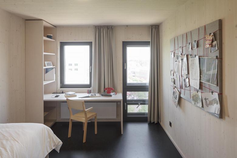 Die 20 m² großen Apartments wurden inklusive ihrer Einbauten komplett aus Vollholz vorgefertigt. Mit Ausnahme des Bodens aus Naturkautschuk sind alle Oberflächen holzsichtig belassen worden. Sie schaffen ein angenehmes und gesundes Raumklima für die Bewohner. Die hinterlüftete Vorhangfassade aus vorvergrauter Lärche und ist ebenfalls vorgefertigt.