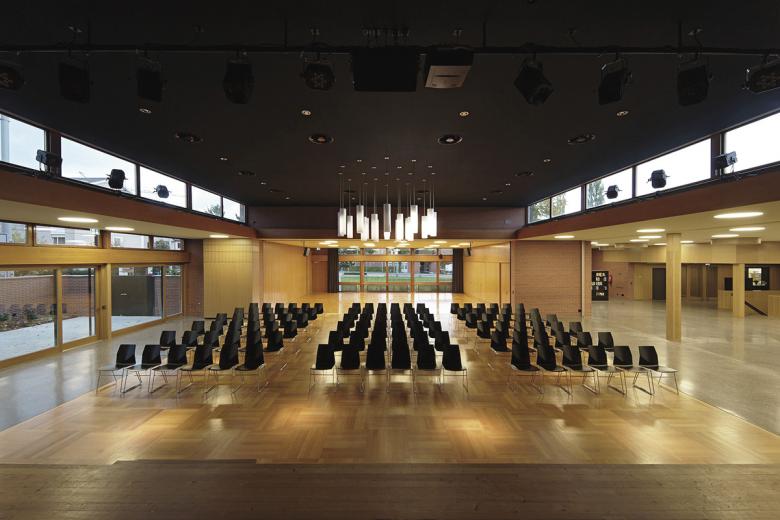 Auch ein in Würde gealtertes Gebäude wie dieses klassische Raumensemble aus den Sechzigern braucht irgendwann eine Verjüngungskur. In diesem Fall war der Auslöser dafür eine veraltete Haustechnik, die komplett ersetzt werden musste. Aber auch die räumliche Struktur musste modernisiert werden, denn das für drei Säle zuständige Foyer war eigentlich viel zu klein. Die Lösung des Problems fand sich im Einbezug des früheren Innenhofs, der hierfür ins Volumen integriert wurde. Grosse runde Oberlichter bringen Tageslicht in den Raum. Nachts zaubern die darin integrierten Leuchten zusammen mit illuminierten Stehtischen eine festliche Stimmung. Mit der bestehenden Substanz aus rotem Sichtmauerwerk, viel Naturholz und Kunststeinböden wurde behutsam umgegangen; die neuen Elemente wurden sorgfältig eingepasst.