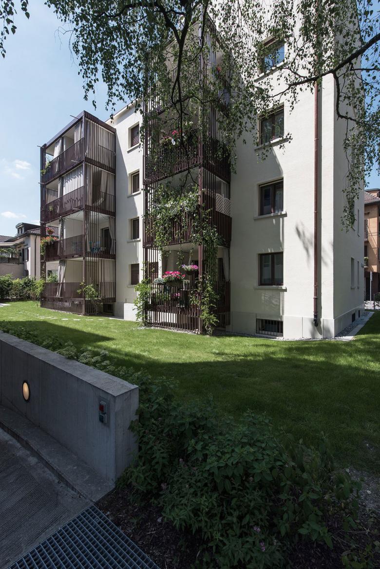 Das zweckmässige Gebäude wurde in den 80er Jahren als Alterswohnhaus einer Genossenschaft erbaut. Doch es fehlte ein Lift, der im Interesse der vorwiegend älteren Bewohnerschaft 2007 nachgerüstet wurde. Der verglaste Liftschacht wurde als Stahlgerüst in millimetergenauer Arbeit durch das Dach in das Treppenauge gesenkt.