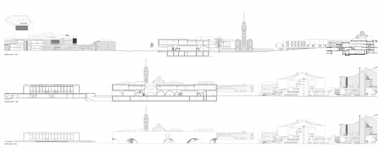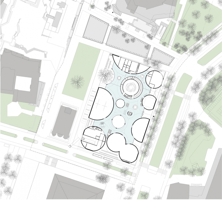 Zur Matthäuskirche hin übernimmt das Museum die Flucht der ehemaligen Bebauung des ‚Geheimratsviertels’ auf und wird damit raumbildend für den Matthäikirchplatz.