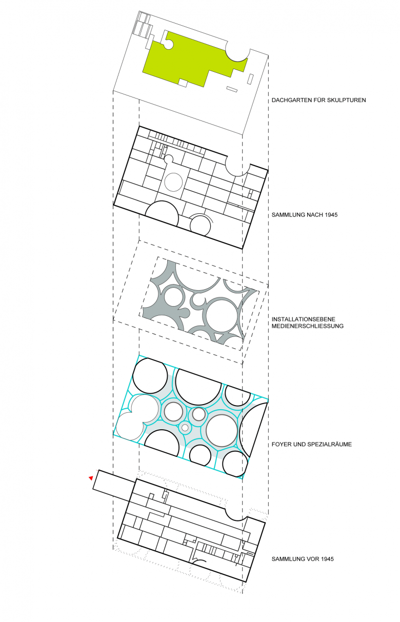 Zwischen Philharmonie, Staatsbibliothek und neuer Nationalgalerie gelegen, begreift sich der Museumsbau als Synthese von Mies’scher Einfachheit mit Scharouns Verspieltheit. Eine einfache Organisation des Programms auf drei Hauptgeschossen erlaubt zukünftigen Besucherinnen und Besuchern eine leichte Orientierung bei gleichzeitiger räumlicher Komplexität. Das weitverzweigte Foyer im Erdgeschoss umspielt sämtliche Spezialräume, in denen wechselnde Veranstaltungen und Ausstellungen stattfinden werden. Von dieser räumlichen Mitte, welche als erweiterter öffentlicher Stadtraum konzipiert ist, erschliessen sich die Räume mit permanenter Sammlung im Obergeschoss (Kunst nach 1945) und im Untergeschoss (Kunst vor 1945) mit Anbindung an den Mies van der Rohe-Bau.