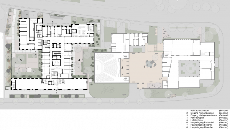 Die Neubauten für das Sozialwerk Pfarrer Sieber denken also das für das bestehende Kirchenzentrum kennzeichnende System von in Höhe und Tiefe gestaffelten Volumen, Mauern und Höfen weiter. Sie fügen ihm vier einfache, rechteckige und aneinandergeschobene Volumen hinzu: Mittig liegt das viergeschossige Fachspital, entlang der Wehntalerstrasse erstreckt sich ein schlanker, dreigeschossiger Administrationsbau, im Nordosten fasst ein niedriger Baukörper den nördlichen Zugang zur Kirche und im Nordwesten steht ein sechsgeschossiges Gebäude für das begleitete Wohnen. Die drei um das Fachspital gruppierten Volumen haben alle ein- oder zweiseitig vorspringende Sockel, aus denen sich Mauern entwickeln. Die neuen Gebäude und Mauern scheiden drei klare, unterschiedliche Aussenräume aus: einen parkartigen grünen Hof zur Kirche hin, einen Gartenhof im Westen und einen schmalen Erschliessungshof an der Riedenhaldenstrasse. In Analogie zum Kirchenzentrum werden die Haupteingänge des Fachspitals und des begleiteten Wohnens, geschützt und weitab von Alltagshektik und Strassenlärm, über die beiden neuen, grünen Höfe erreicht.