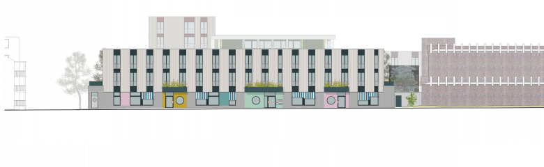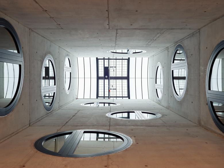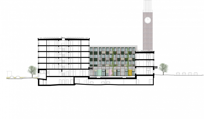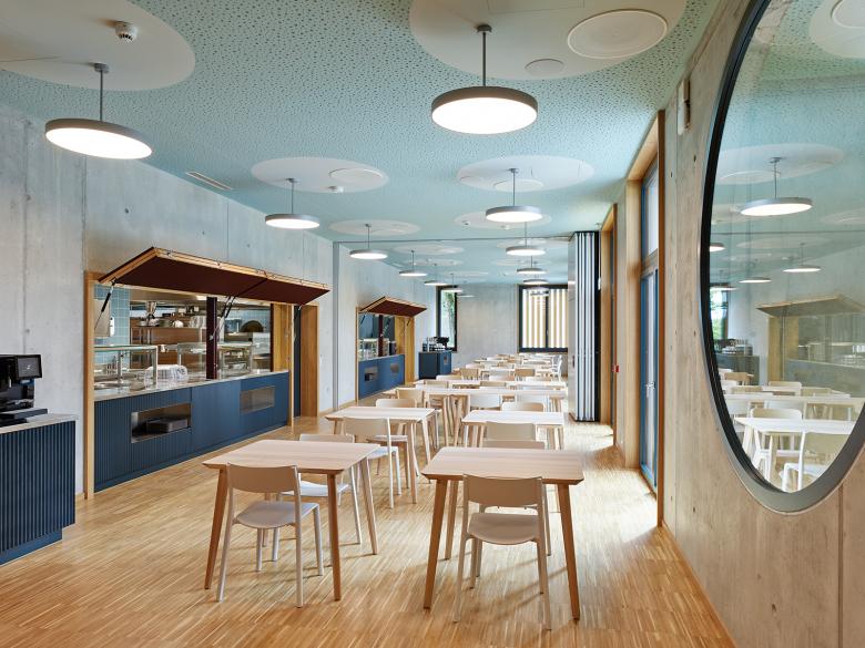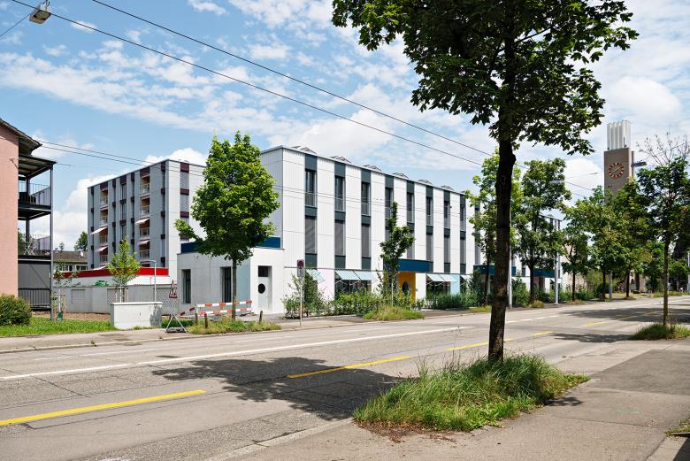 Die Neubauten suchen über ihre Stellung und Proportionen auch den Dialog mit der weiteren Nachbarschaft und mit der Stadt. Das langgestreckte Administrationsgebäude führt die Anlage direkt an die Wehntalerstrasse und verknüpft sie so mit dem öffentlichen Raum. Auch über die langen, schlanken Proportionen der drei peripheren Volumen, vor allem aber über den sechsgeschossigen Baukörper im Nordwesten, entsteht eine formale Beziehung zu den angrenzenden Wohnzeilen. So wird der Inselcharakter des erweiterten Zentrums Glaubten an gewissen Stellen aufgelöst und die Neubauten integrieren sich auf selbstverständliche Weise ins Stadtgefüge.