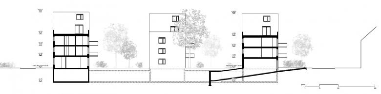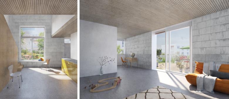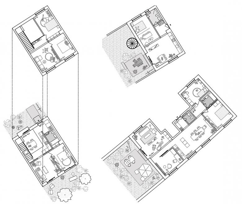Das Erdgeschoss ist als dichte, reihenhausähnliche Bebauung entwickelt. Im dritten Obergeschoss erschliessen die Treppenhäuser jeweils zwei Kleinwohnungen mit direktem Zugang auf die Dachterrassen. Die darüberliegenden Wohnungen mit ihren Balkonen sind über aussenliegende Treppen mit den angrenzenden Dachflächen verbunden. Die grossen Dachflächen stehen den Bewohnern zur gemeinsamen Gestaltung zur Verfügung und können als Spielplatz, Küchengarten oder gemeinsame Grillstelle genutzt werden. Neben den kleinteiligen Erdgeschossgärten entsteht so über den Dächern eine zweite Gartenebene als vielfältiger Lebensraum.