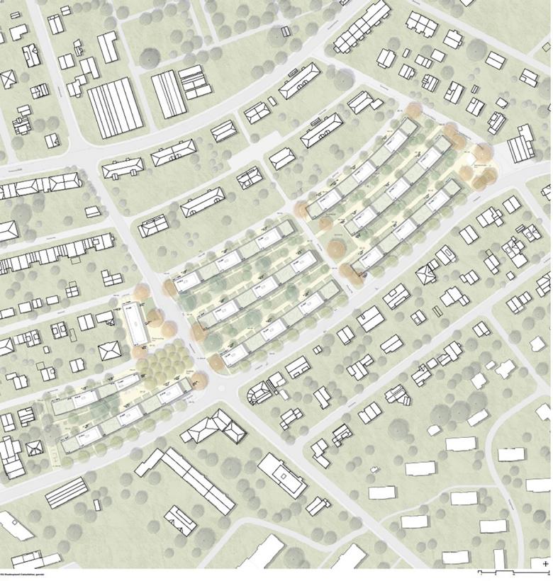 Teile der bestehenden Wohnhäusern aus den 1940er-Jahren sollen im Rahmen einer Verdichtung ersetzt werden. Die lockere Anordnung von Zeilen aus Einzelbauten formen im Bestand weitläufige Zwischenräume die teils als private Gärten, teils als gemeinsam bewirtschaftete Flächen genutzt werden. Nachbarschaftlichkeit misst sich hier am Bodenkontakt sowie am Umgang mit gemeinsamer und individueller Infrastruktur. Freistehende Häuser auf privaten Grundstücken zeichnen die umliegenden Stadtbereiche aus. Die kleinteiligen Gartenräume und Parzellenstrukturen charakterisieren ruhige Wohnstrassen. Diese vielfältige Lebenswelt wird mit den vorgeschlagenen Ersatzbauten in eine zeitgemässe und verdichtete Wohnform überführt. Reihenhäuser und Geschosswohnungen fügen sich zu einem hybriden Ganzen, das sich in die lockere Bebauung der Gartenstadt einfügt und einen grossen Reichtum an Wohnformen und Aussenbezügen schafft. Die vorgeschlagenen Neubauten schreiben so die vorgefundene Zeilenstruktur weiter und bilden gemeinsam mit der mittleren Gebäudereihe zwei Wohnstrassen.