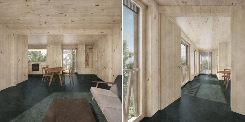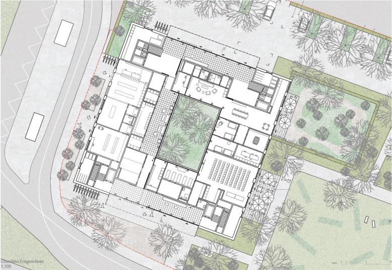 Im Osten des Neubaus bildet der grosse Grünraum einen weichen Übergang zu den angrenzenden Nutzungen. Wo immer möglich wird die Bestandsvegetation erhalten und ergänzt. Herz des Gartens bildet eine weggefasste Rasenlichtung, die mit Staudenbändern durchsetzt ist. Die Erschliessung ist als Spazierpromenade angelegt und erlaubt das Wandeln, Verweilen und Treffen in introvertierten Atmosphäre. Gesäumt wird der Raum von einem Baumkörper, der mit Strauchgruppen durchsetzt ist und eine grüne Kulisse bildet. Die Organisation des Raums schafft eine übersichtliche Gartenanlage, die einlädt mit NachbarInnen oder BesucherInnen ins Freie zu gehen und in direkter Nähe zum Wohnraum in eine grüne Oase einzutauchen. Die Terrasse des Gemeinschaftsraums kann von innen sowie von aussen genutzt werden.