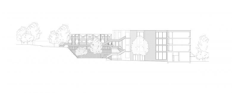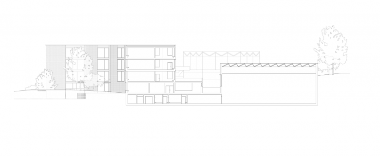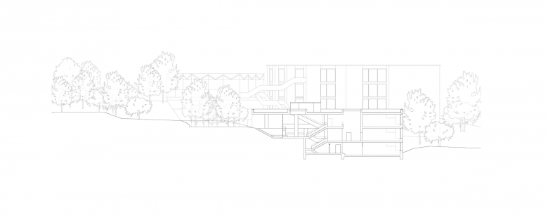 Der Neubau für die Sekundarschule übersetzt die gekrümmte Form des Grundstückes in einen progressiv abgetreppten Körper. Talseitig ergänzt das liegende Volumen die Skyline der Anlage. Bergseitig begrenzt der Neubau zusammen mit Primarschulhaus, Saal und Turnhalle eine ansteigende Sequenz von Höfen, welche vom Ankunftsplatz am neu zurückversetzten Ende der Nägelimoosstrasse auf das Hochplateau der Sportanlagen leitet. Im Innern ergibt sich aus dem Wechselspiel zwischen Aussenform und Zimmerstruktur eine sich erweiternde und komprimierende Erschliessungsfigur, welche immer wieder neue und überraschende Blicke ins Freie eröffnet. Die Klassenzimmer sind jeweils paarweise mit zwei Gruppenräumen kombinierbar. Grosszügig bemessene Falttüren ermöglichen unterschiedliche Raumaufteilungen für kleine Gruppen, grosse Gruppen und für klassenübergreifende Projekte.