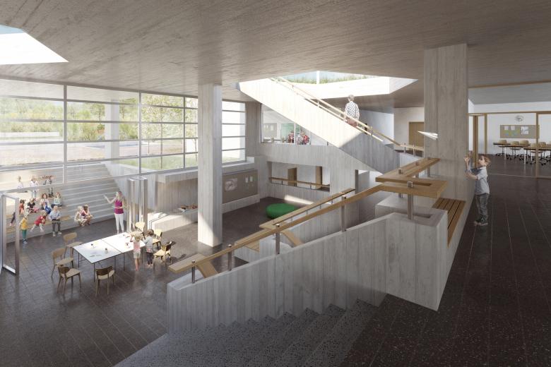 Bei der Primarschule entsteht schon heute im Wechselspiel zwischen der hellen, einbündigen Anlage des Neubaus und der spektakulären Hallenschule eine attraktive Lernumgebung mit zahlreichen Gelegenheiten für unterschiedliche Unterrichtsszenarien. Diese leistungsfähige Struktur lässt sich mit lokalen Massnahmen einfach an die neuen Anforderungen anpassen. Oblichter und zusätzliche Ausgänge zum erweiterten Pausenplatz im ersten Obergeschoss, zur neu angelegten Dachterrasse und zum Eingangshof der Sekundarschule reichern das Beziehungspotenzial der zentralen Halle weiter an und bringen zusätzliches Tageslicht in den tiefen Raum. Der nicht unterkellerte, östliche Flügel wird im unteren Geschoss auf Erdgeschossniveau abgesenkt, so dass eine selbstverständliche Beziehung zum neuen Seiteneingang entsteht. Im Erdgeschoss werden die Lehrerzimmer und Spezialräume angeordnet, im Obergeschoss die Klassenzimmer und Gruppenräume. Für die Organisation der neuen Gruppenräume sind unterschiedliche Varianten denkbar. Wir schlagen vor, die Gruppenräume so zwischen die Klassenzimmer zu legen, dass sie direkt von diesen aus erreichbar sind. Alternativ wäre es aber auch möglich, im nördlichen Flügel einen kompakten Block zu organisieren, wodurch die Gruppenräume je nach Bedarf auch zu grösseren Raumeinheiten kombinierbar wären.