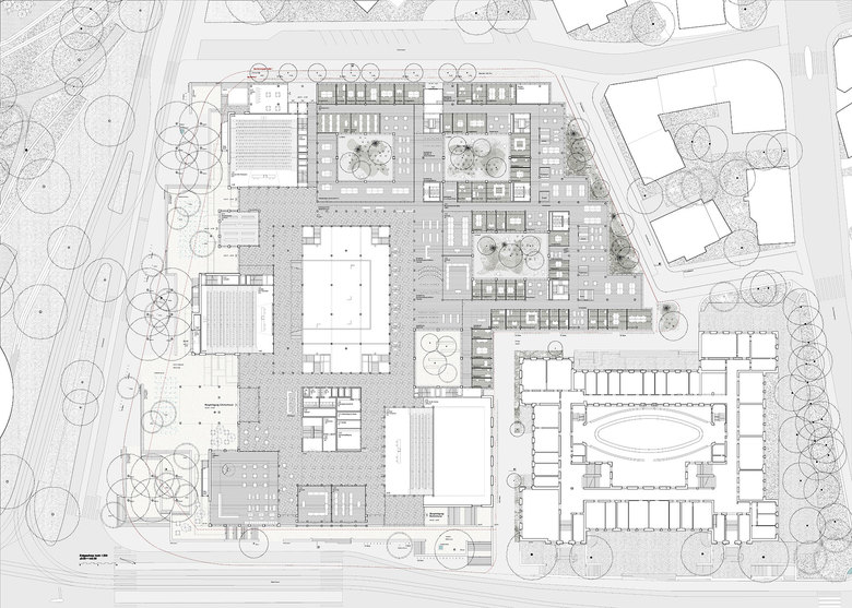 - Eine dritte Gruppe von Räumen dient den formalisierten und feierlichen Formen der Versammlung, der Präsentation und Repräsentation: Vorlesungen, Vorträge, Ausstellungen, Kongresse und Feste. Hörsäle in unterschiedlicher Grösse öffnen sich theaterartig von allen Seiten auf die Forumshalle, die dadurch selbst zum zentralen Orientierungs- und Repräsentationsraum wird.
