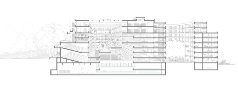 Zwischen Agora und Forumshalle staffeln sich die Räume mit der höchsten Nutzungsdichte zu einer durchlässigen Schicht aus Hörsälen, Seminarräumen und Lernlandschaften. Diese hoch frequentierten Bereiche sind nicht allein von innen über die Treppen und Lifte der Forumshalle erreichbar, sondern auch über ein verzweigtes System aussenliegender Freitreppen und Terrassen erschlossen. Diese begehbare Schauseite bezieht den Freiraum der Agora aktiv ins universitäre Leben ein. Die Universität präsentiert sich der Stadt als offene und zugängliche Institution.