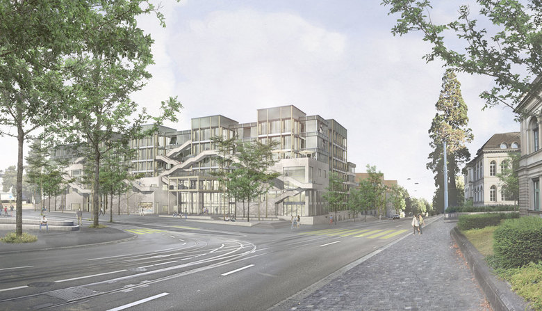 Die gestaltete Topografie der ehemaligen Stadtbefestigung mit ihren Bastionen und Plattformen ist im Hochschulquartier immer noch spürbar. Freitreppen, Stützmauern, Terrassen und eine Vielzahl von inszenierten Wasserspielen und Trinkbrunnen erzeugen eine charakteristische Stimmung. Der Entwurf nimmt diese Themen zunächst in der Umgebungsgestaltung auf, entwickelt sie weiter und verwebt sie schliesslich mit dem Raumprogramm der Universität. Auf Hörsaaltürmen entstehen Dachterrassen, Fluchtwege werden zu Freitreppen, erkerartige Seminarräume rhythmisieren die Fassaden, ein grosses Wasserbecken am Boden des Forums nimmt das Dachwasser auf.