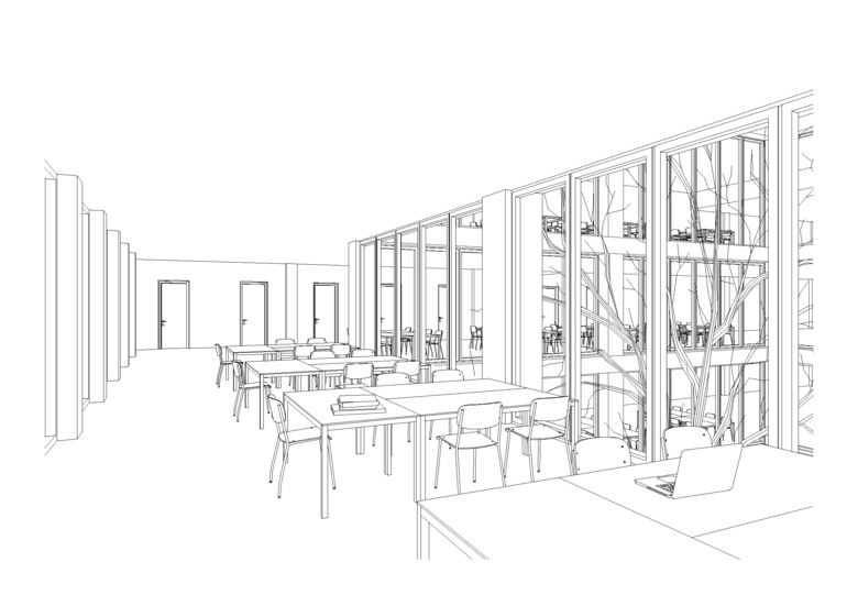 - Eine grosse Vielfalt an unterschiedlich dimensionierten, konfigurierten und vernetzten Raumangeboten ermöglicht das Lernen in Gruppen, Diskussionen im Forschungsteam, Seminare, Gruppenarbeiten, Symposien und andere Formen der wissenschaftlichen Zusammenarbeit: von der Galerie am zentralen Forum über die offene Arbeitslandschaft im Forschungstrakt bis zum Semiarraum mit Aussicht über die Stadt.
