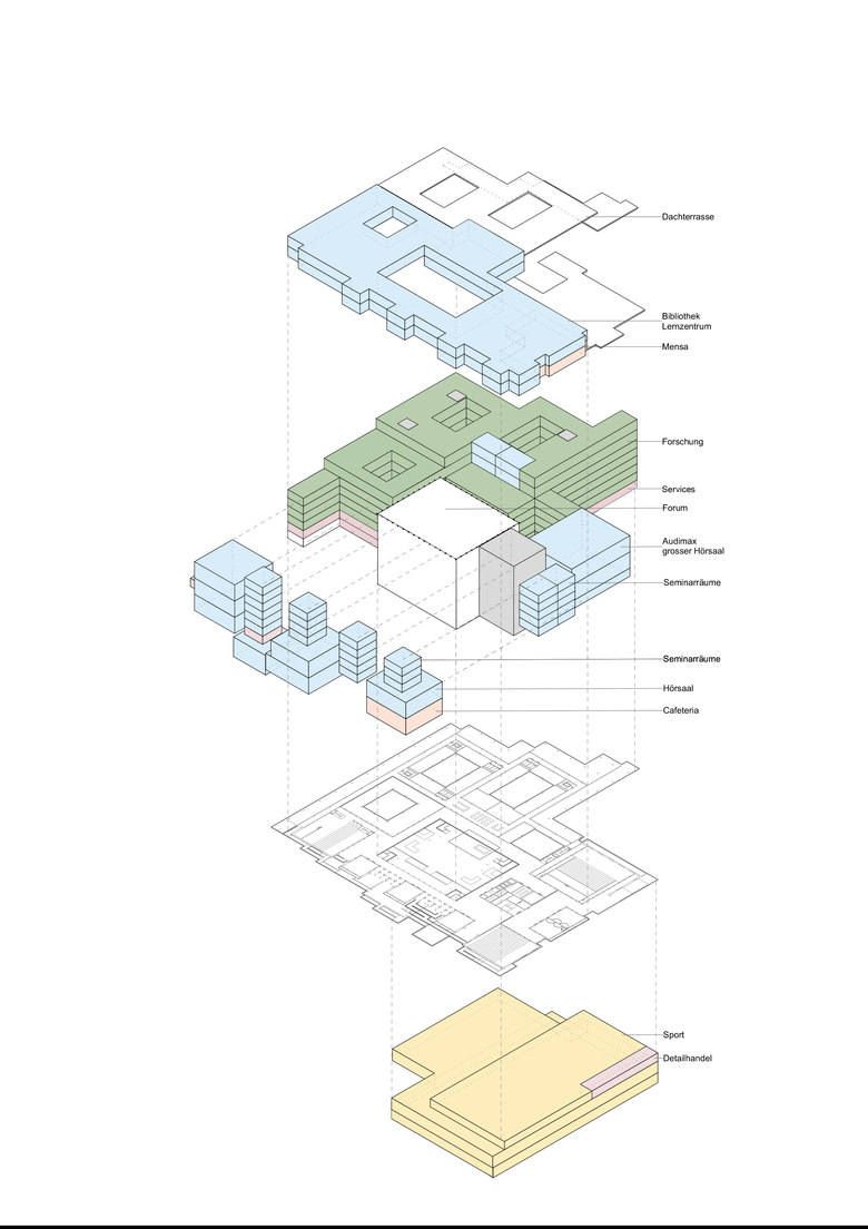 Die Forumshalle bildet das Herzstück der räumlichen Organisation. Dank einem Glasdach, das bei schönem Wetter geöffnet wird und einem grossen Wasserbecken am Boden herrscht hier die Stimmung eines überdeckten Stadtraums. Alle Teilbereiche des reichhaltigen Programms öffnen sich auf diesen zentralen Orientierungsraum und kommunizieren über vertikale und horizontale Blickbeziehungen: Hörsäle und Lernlandschaften im Westen und Süden, das Netzwerk der Forschung mit den repräsentativen Adressen der Fakultäten und Institute im Osten und Norden, die Sportanlagen als unterer und die Bibliothek als oberer Abschluss. Im alltäglichen Semesterbetrieb dienen die kaskadenartig getreppten Plattformen als Forschungs- oder Lernlandschaften und als Treffpunkte. Zeitweise werden aber auch Teilbereiche für kleinere und grössere Anlässe in Besitz genommen – Feiern, Kongresse, Ausstellungen oder Symposien. Und in regelmässigen Abständen wird die ganze Halle für ein grosses Fest genutzt.
