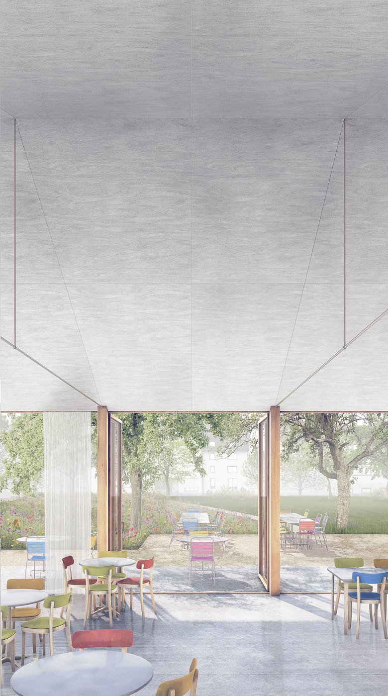 Das Hauptmerkmal des Hauses bildet der schlanke, parallel zum Park verlaufende Saal. Dieser fasst die Nutzungen von Shop, Theke, Cafeteria und Speisesaal zusammen und bildet am Ende auf selbstverständliche Art und Weise eine Hauptadresse zum Kirchenvorplatz. Das Schnittprofil des Raums macht das schützende Dach zum Motiv. Die flächige Beplankung der Deckenunterseite ist hell gestrichen und verleiht dem Saal schlichte Noblesse und Festlichkeit. Durch diese neutrale Leichtigkeit sind viele unterschiedliche Nutzungen des Raumes denkbar. Gleichzeitig bringen die bunten Farbtöne der Möblierung eine Lebendigkeit mit, die im Farbspektrum des Parks seine Fortsetzung findet. Das geringe Achsmass der Struktur ermöglicht schlanke Stützen die mit den Rahmen der raumhohen Fenstertüren deckungsgleich sind. Die gleichmässige Befensterung entlang des gesamten Saals – gartenseitig vollständig öffenbar - wird so zum Panoramablick in den Park. Die transparenten Enden des Raums unterstreichen diese Offenheit und ermöglichen differenzierte Blicke in die unterschiedlichen Teile des Parks. Gleichzeitig ist es prinzipiell möglich, den Raum mittels Vorhängen in regelmässigen Abständen zu unterteilen. Die zentrale Schicht des Gebäudes beherbergt sämtliche Nebenräume der Küche, sanitäre Einrichtungen sowie die Erschliessung des Untergeschosses. Die dem Speisesaal gegenüberliegenden Räume umfassen die Arbeitsräume der Grossküche. Diese sind über der Arbeitshöhe verglast und ermöglichen Blickkontakt untereinander sowie die Sichtbarkeit des durchlaufenden Dachprofils. Die serielle Anordnung der Arbeitsräume in Kombination mit dem rückwärtigen Korridor erlauben effiziente Arbeitsabläufe mit kurzen Distanzen und eine einfache Trennung zwischen sauberen und schmutzigen Zonen. Die lange Theke im Saal kann über das Office bedient werden, während das Schmutzgeschirr auf der anderen Seite zum Abwasch transportiert wird. Die zur Umgebung niveaugleiche An- und Auslieferung erfolgt über den asphaltierten Weg. Das Untergeschoss mit zentralem Korridor ist flächenoptimiert und bietet trotzdem ausreichend Raum zum Rangieren von ein- und ausgehendem Material. Die Fassade ist umlaufend mit Fenstern auf unterschiedlicher Höhe versehen und ermöglicht dem Haus zu allen Seiten hin eine differenzierte Beziehung zum Aussenraum herzustellen ohne explizite Vorder- und Rückseiten auszubilden. Der Betrieb der Küche ist so vom Kirchenvorplatz als auch vom Foyer im Haus Domino aus sichtbar und erhält Wichtigkeit und Präsenz.