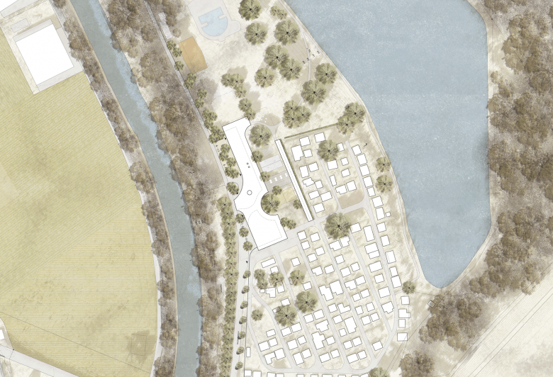 Im Strandbad wird die Gliederung des langgestreckten Gebäudes mittels der eingeführten Geometrie des Kreises weitergeführt. Ein den Besucher elegant umarmendes Halbrund schafft einen Ankunftsort. Das prägnant vorstehende Dach am Ende des Gebäudes bildet einen Abschluss und schafft einen Übergang zu den Baumkronen der Liegewiese. Die Nutzwiese wird auf der gegenüberliegenden Seite von den Familienkabinen entlang der dahinterliegenden bestehenden Hecke gefasst.