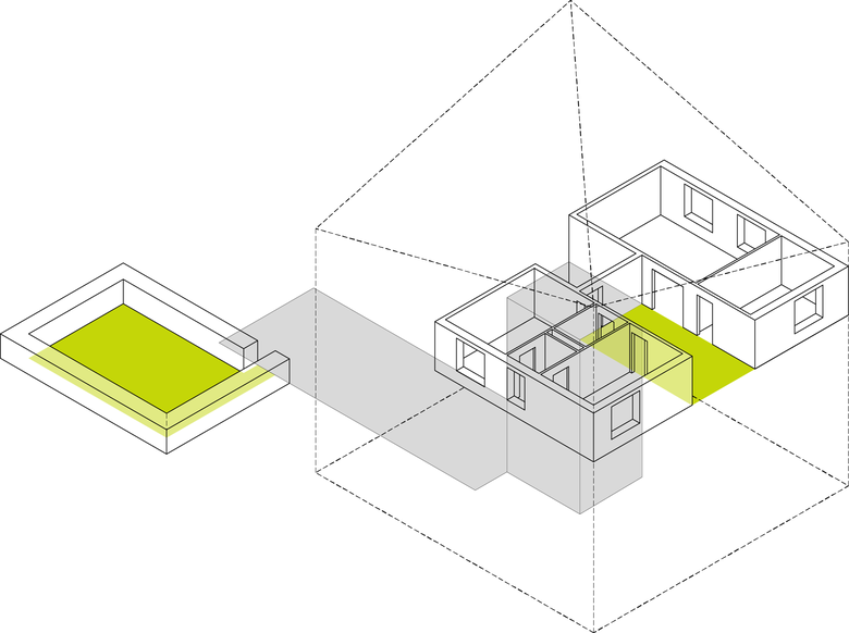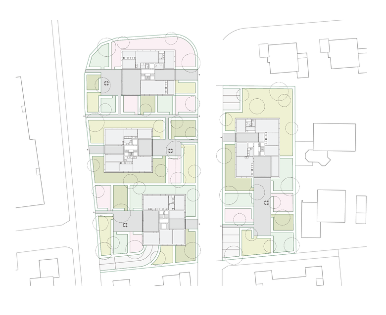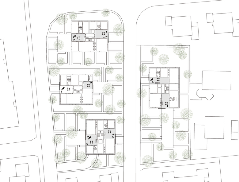Wir organisieren das Programm in vier zweispännig erschlossenen Häusern, welche sich in Korngrösse und Wohnvorstellung an den Stadtvillen orientieren und im Massstab zwischen Einfamilienhäusern und Wohnblöcken vermitteln. Sie zeichnen sich durch vielfältige Durch- und Ausblicke und eine dreiseitige Orientierung der Wohnungen aus. Im Aussenraum entstehen in erster Linie private Gärten. Ein kleiner Spielplatz dient den Kindern aus der Überbauung. Grössere, öffentliche Grünanlagen und Sportplätze finden sich in nächster Nähe.