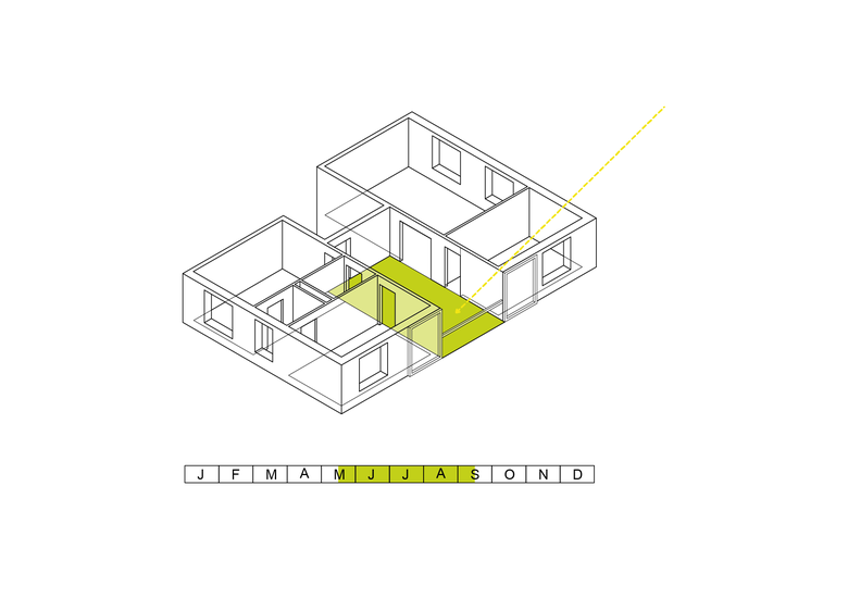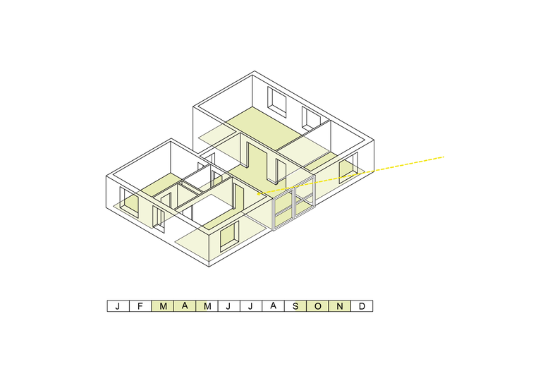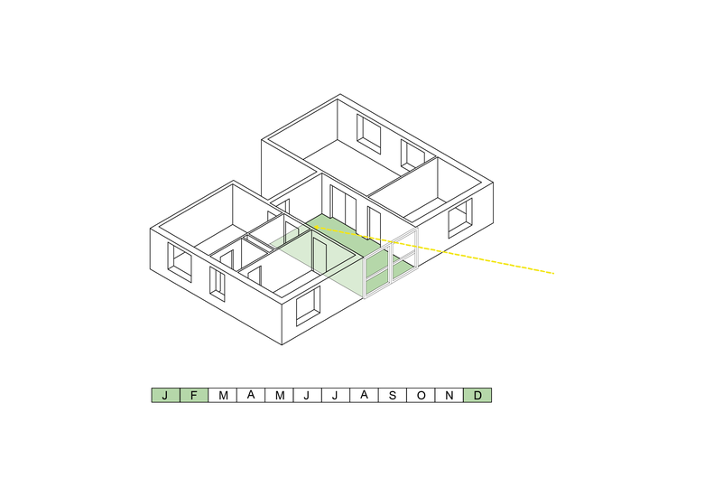 Im Innern gruppieren sich alle Wohnräume um ein grosses, zentrales Gartenzimmer, welches die Nutzflächen von Korridor und Loggia vereinigt. Im Sommer lässt es sich dank aussenliegenden Schiebefenstern in eine gedeckte Terrasse verwandeln. In der Übergangszeit bietet es zusätzlichen Wohnraum als Spiel- oder Esszimmer. Im Winter ist seine Temperatur leicht niedriger als in den beheizten Wohnräumen. Somit eignet es sich ausgezeichnet zum Überwintern der Pflanzen. Richtig kühl wird es allerdings nie, da es in der ausgezeichnet gedämmten Gebäudehülle mit einschlossen ist und hochwertige Verglasungen die wärmende Sonne einfangen.