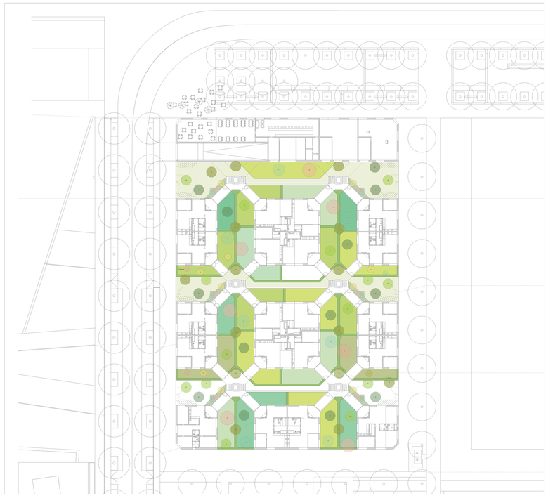 Bei Baufeld 4 wird das Treppenhaus der Vierspänner ausgelagert und erzeugt so eine neue Nachbarschaft zum Vis-à-Vis. Der Zugang zur Wohnung durchläuft eine graduelle Verschiebung vom Öffentlichen hin zum Privaten: Treppenhaus - Laube - Wintergarten - Wohnung.