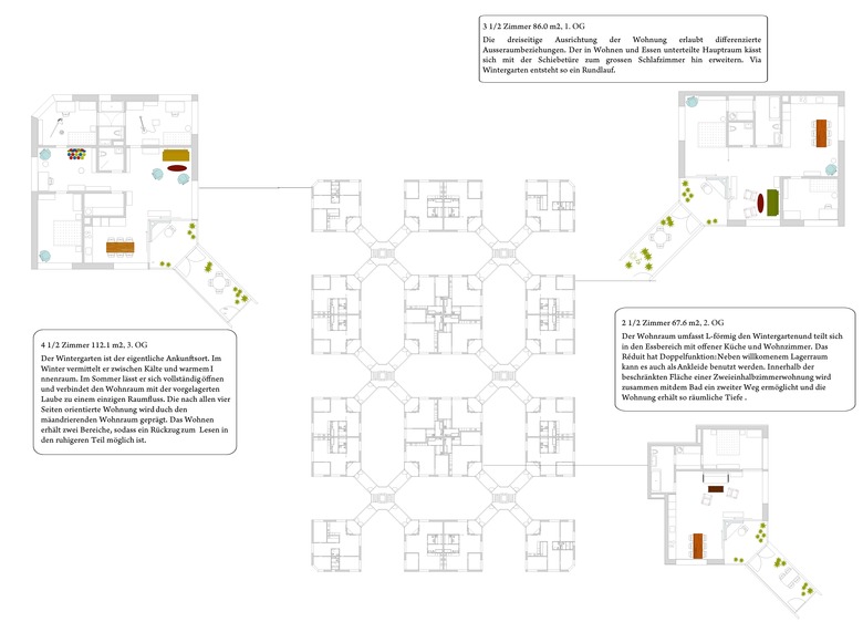 Neue Wohnformen: Veränderte Familienstrukturen erfordern möglichst flexibel anpassbaren Wohnraum. Sei es für Patchworkfamilien oder dass mehrere Generationen im gleichen Haushalt wohnen. Gleichzeitig nimmt aber auch das Bedürfnis des Menschen nach der eigenen Privatsphäre zu: Die Flexibilitätsbespiele zeigen neben dem geforderten Wohnungsschlüssel eine ganze Reihe zusammenschaltbaren Einheiten: Die pubertierenden Teenager erhalten mit einer kleinen über die zusammengehängte Laube erschlossenen Dependance ihr eigenes Reich. Oder die Grossmutter wohnt im Stöckli gleich nebenan. 'Wohnen und Arbeiten' schliesslich drängt sich innerhalb der Struktur geradezu auf.