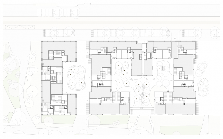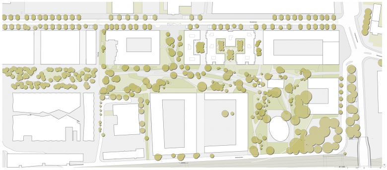 Der grosse Freiraum des Riedparks kontrastiert mit Baufeldern von metropolitaner Dichte auf dem Geistlich-Areal. Eine durchlässige, „poröse“ Bebauungsstruktur reagiert auf diese spannungsreiche Ausgangslage. Intimere Stadträume ergänzen die grossen, primären Setzungen des Gestaltungsplanes. So ergeben sich vielfältige Blickbeziehungen aus den öffentlichen Räumen und aus den Wohnungen hinaus in den Park. Zugleich entsteht eine Vielzahl von primären und sekundären Wegverbindungen.