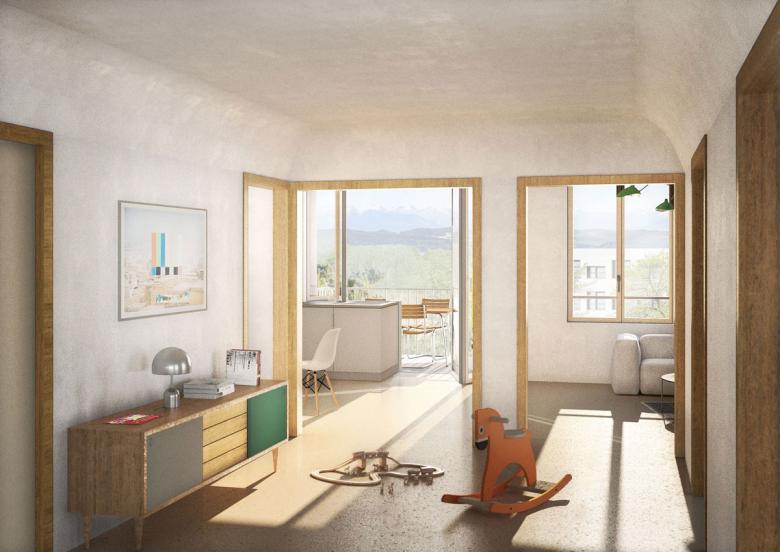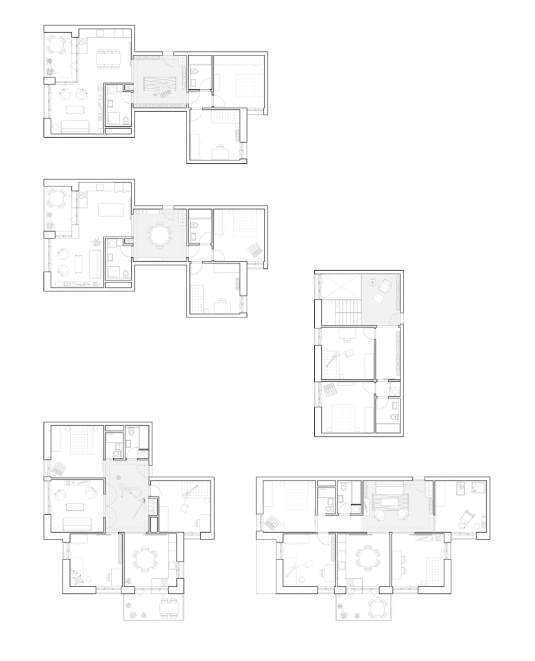 ZELLENSTRUKTUR Herzstück der Wohnungen bildet eine grosszügige Eingangshalle, welche als Spielzimmer, Wohndiele, Bibliothek oder Essplatz nutzbar ist. Dieser Zentralraum erschliesst identische, nutzungsneutrale Zimmer von quadratischem Grundriss. Es entsteht eine Zellenstruktur, welche unterschiedliche Konfigurationen von Individualität und Gemeinschaft ermöglicht. Eine Familie, die Feriengäste beherbergt oder eine Wohngemeinschaft mit beschränktem Budget kann den gemeinschaftlichen Bereich auf Essküche und Wohnhalle einschränken und erhält so in einer Vierzimmerwohnung vier unabhängige Individualzimmer. In anderen Lebenssituationen reduziert sich die Zahl der abgetrennten Zimmer und der gemeinschaftliche Bereich erweitert sich um ein Wohnzimmer und / oder ein Arbeitszimmer.