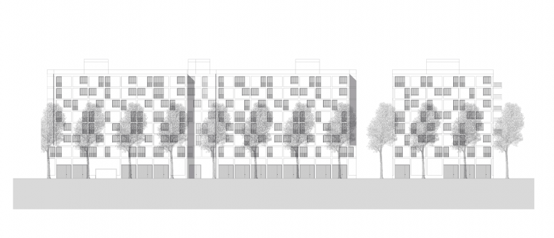 BELETAGE Im Erdgeschoss liegen somit neben den Hauszugängen und Gewerberäumen auch die Wohn- und Esszimmer der erwähnten Maisonetten. Die Individualräume dieser Wohnungen befinden sich im ersten Obergeschoss. Diese „Beletage“ wird auch architektonisch mit dem Erdgeschoss zusammengefasst und formuliert einen der Gebäudehöhe entsprechenden Sockelbereich. Im Unterschied zur von einspringenden Loggien geprägten Volumetrie der Obergeschosse entsteht in Erdgeschoss und Beletage eine einfachere Fassadenabwicklung mit verglasten Wintergärten.