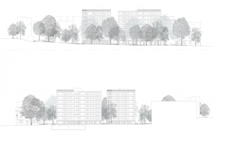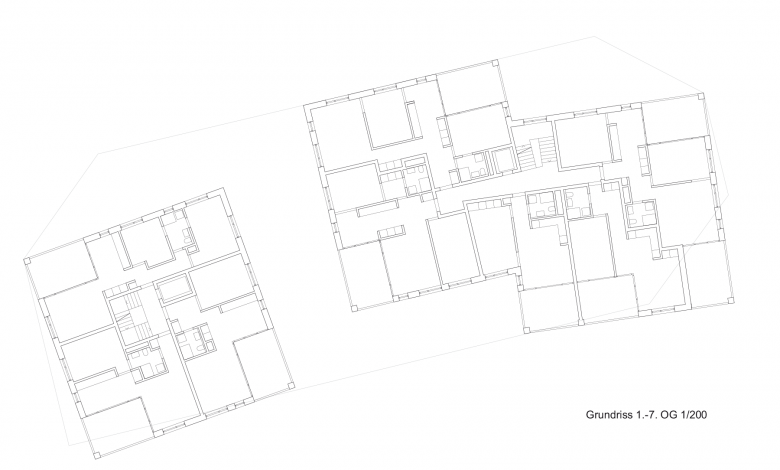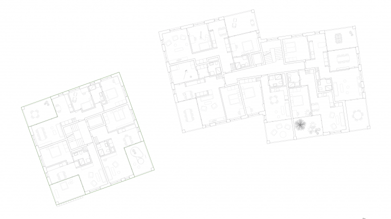 Alterswohnungen. Das grössere, fünfspännigen Volumen wiederum eröffnet eine ganze Palette an Wohnszenarien, vom aufs Minimum reduzierten Studio bis zur dreiseitig ausgerichteten Enfilade mit zwei Balkonen. So entstehen Wohnungen mit ganz spezifischen räumlichen Eigenschaften und Nutzungsmöglichkeiten.