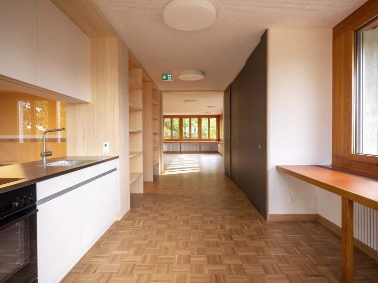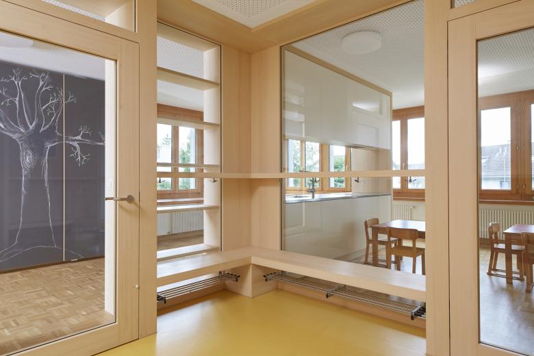 Ursprünglich war das Schulhaus geschossweise mit je zwei Klassenzimmern organisiert. Das Treppenhaus mit der Korridorsituation und den Garderoben bildete die räumliche Erschliessung. Durch die Setzung des zentralen Lifts und der Verknüpfung zweier Klassenräume werden anstelle der ursprünglichen Korridorsituation neue Raumqualitäten als Begegnungsraum für die Kindergärten geschaffen. Der neu definierte vertikale Treppenraum mit den ausgeschnittenen Lichthöfen ist das verbindende Element zum Aussenraum.