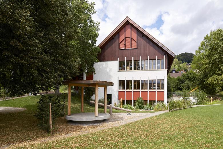 Werden Kinder dazu aufgefordert ein Haus zu zeichnen, hat es oft ein schräges Dach, Fenster mit Sprossen und eine Türe als Eingang. Das bestehende Schulhaus Schwärze aus dem Jahre 1987 transportiert dieses Bild umgeben von einem grossen Garten zum Spielen. Das neue Kindergartenzentrum nutzt die ortsspezifische Qualität und führt diese in ein eigenständiges architektonisches Konzept mit drei Kindergärten inmitten eines Wohnquartiers. In der neu gestalteten Umgebung entstehen unterschiedlich definierte Zonen für die jeweiligen Kindergärten. Die neuen Grundrisse basieren auf der bestehenden dreigeschossigen Schulhaustypologie. Mit der Erfindung eines Garderobenmöbels und einer räumlichen Zusammenfassung zweier Schulzimmer werden geschossweise einfach zonierte Kindergärten organisiert. Die allseitige Belichtung macht den Tageslichtverlauf erlebbar und lässt den Blick frei in die neugestaltete Umgebung. Im Dachgeschoss finden ergänzend ein abtrennbarer Raum für den Mittagstisch und eine Aula ihren Platz. Die teilweise herausfordernde aber robuste Materialisierung wurde in ihren Grundzügen übernommen und in ein neues zeitgemässes Gestaltungskonzept eingebunden. Die damit geschaffene freundliche Raumstimmung basiert auf der Komposition natürlicher Oberflächen in Verbindung mit einer darauf abgestimmten Farbigkeit. Der Lift wird zum raumbildenden Bestandteil des neuen Erschliessungskonzepts und ist gegen Aussen als Element in die neue Dachgaube integriert.
