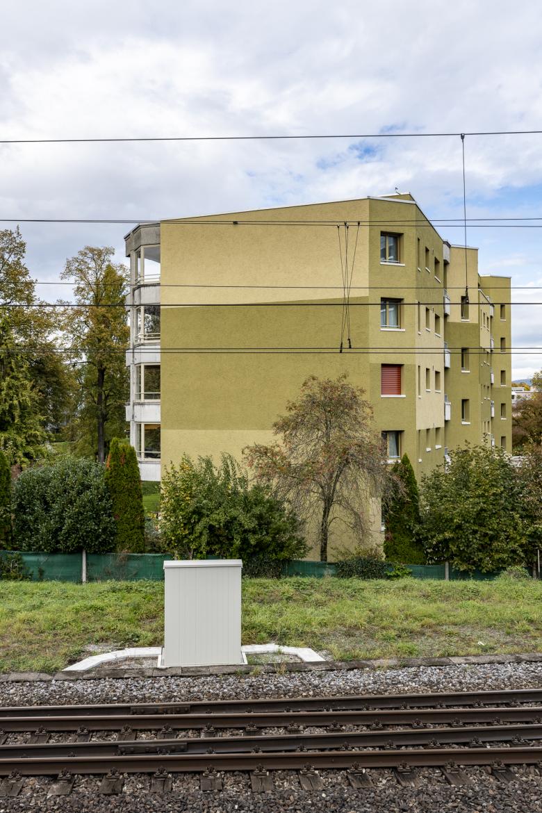 Das fünfgeschossige Wohngebäude mit 22 Mietwohnungen aus dem Jahr 1984 steht an zentraler Lage am Murgufer in Frauenfeld. 2023 findet sich der einst am Rande stehende schlichte und graue Mietwohnungsblock nun plötzlich als integraler Bestandteil einer lebendigen urbanen Umgebung wieder. Entsprechend kleidet sich das Gebäude neu. Die analog eines Bastelbogens in die Fläche gelegte Fassadenabwicklung wird mit einem sich wiederholenden und bewusst in Grüntönen gehaltenen farbigen Fries bespielt. Zusammen mit den polygonalen Vor- und Rücksprüngen entwickeln sich neue spannende Farbräume für die Mieter*innen. Der Baukörper gliedert sich neu und fordert eine neue Lesbarkeit und Identität. Zusammen mit der Farbe Grün wird das Gebäude in Zukunft den Abschluss der zukünftig in Beton- und Holz gehaltenen benachbarten Stadtsiedlung von Diagonal Architekten aus Winterthur bilden. Je nach der Jahreszeit bindet sich das Konzept in die Umgebung ein oder bleibt im Winter grün.