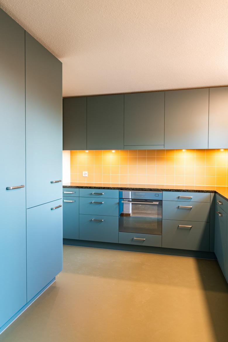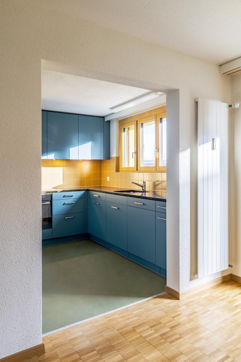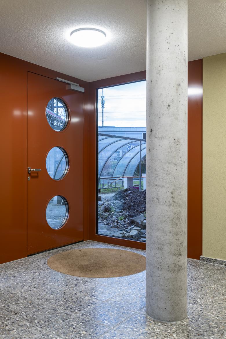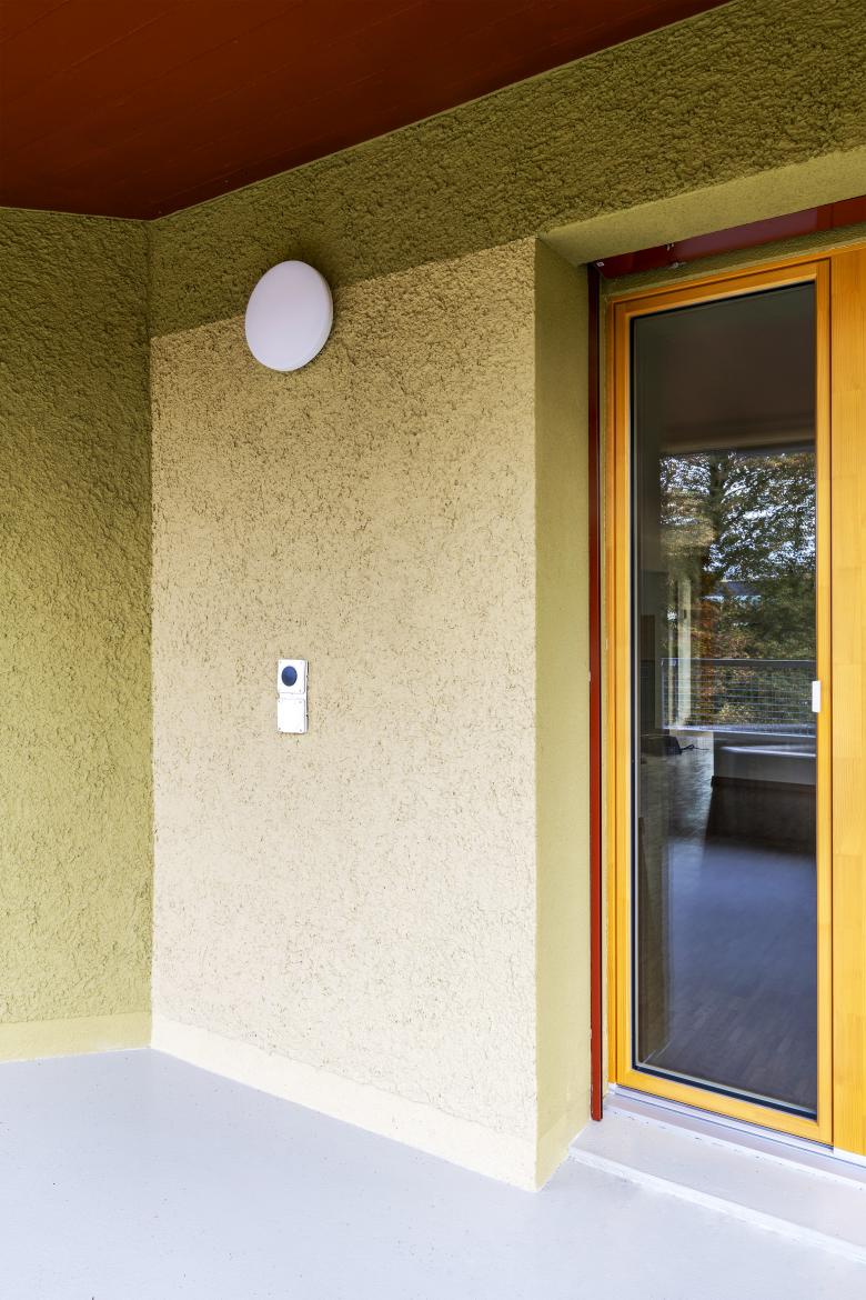 Der Entwurf beschränkt sich auch wenige Grundrisskorrekturen und befasst sich mit einer atmosphärischen und funktionalen Weiterentwicklung der bestehenden Architektursprache. Die bestehende Grundrissabwicklung mit den polygonalen Rück- und Vorsprüngen entwickelt ein spannendes Thema der Verzahnung mit der Umgebung. Gegen Aussen wurden einzig die zu kleinen Eingänge mit einem neuen ausladenden Eingangsbereich bespielt. Die Grundrissgrössen und Typologien konnten mit einfachen Eingriffen in die heutige Zeit geführt werden. Die rationale und robuste Materialisierungen der Innenräume wurden übernommen und mit dem atmosphärischen Element Farbe ergänzt.