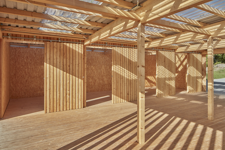 Der Gemeindeplatz, in unmittelbarer Nähe des Gemeindehauses gelegen, dient als Ort der Versammlung und kleinerer, dörflicher Feste. Eine Holzkonstruktion aus Lärche bildet den kommunikativen Treffpunkt und Versammlungsort der Gemeinde. Geschlossene Bereiche dienen als Depot, die offenen Bereiche sind überdacht, um die Bewohner bei Gemeindefesten und -treffen vor Wind und Wetter zu schützen.