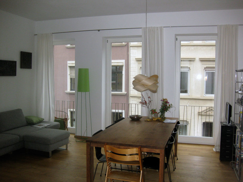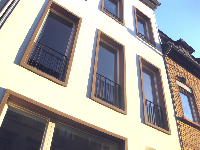 Errichtet als Massivbau mit bis zu 70 cm starken Wänden, stehenden Fensterformaten. In den 70-er Jahren im Rahmen einer zeitgeistigen Sanierung mit liegenden Alufensterformaten, veränderten Raumfolgen und der Anbringung abgehängter Decken weitestgehend zerstört.