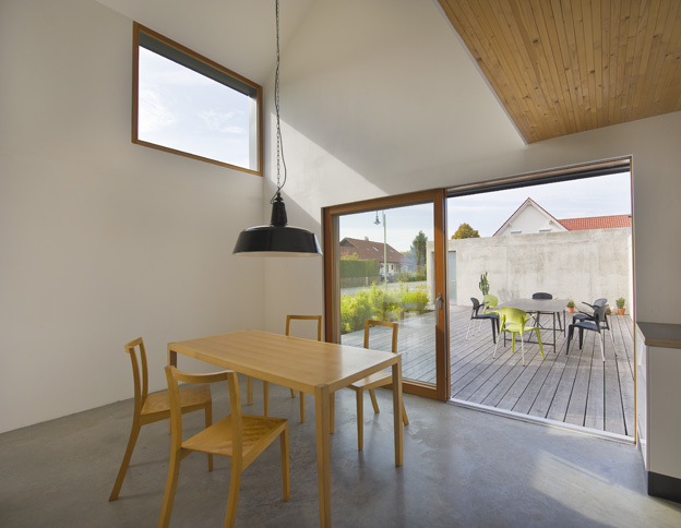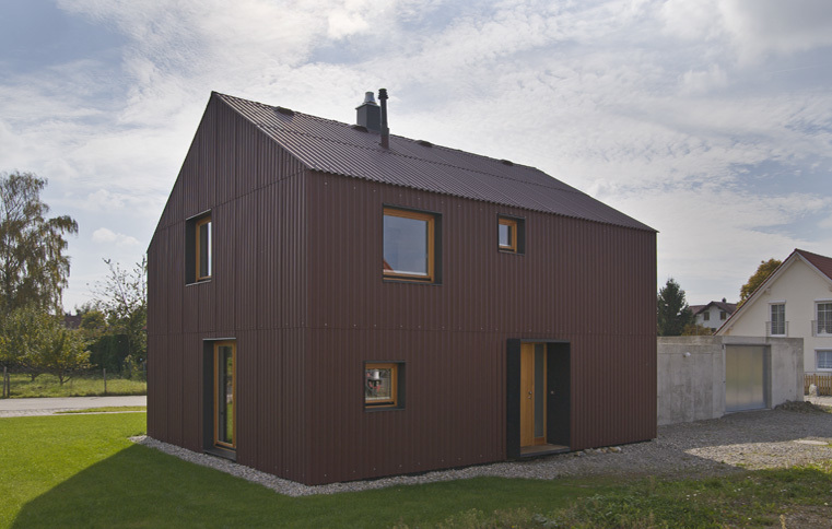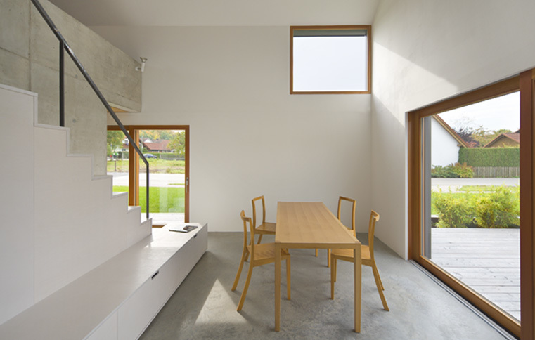 Das Wohnhaus für 125.000.- Euro wurde für zwei Bewohner mit einer Wohnfläche von 90m2 konzipiert. Die Entscheidungen, zur Konstruktion des Gebäudes, der Materialauswahl und Verarbeitung waren maßgeblich von den Baukosten beeinflußt. Der Holzbau stellt mit seinen präzise gesetzten Öffnungen im Erdgeschoss einen starken Bezug zu den Aussenbereichen her. Über dem Essplatz ist ein Luftraum ausgespart der die Geschossebenen großzügig miteinander verbindet. Die Holzterrasse zwischen Wohnhaus und Garage bietet einen privaten Aussenraum der nach Norden mit einer Betonwand und nach Süden mit einem Pflanzbecken abgeschirmt wird. Das kleine Wohnhaus zeigt eine kostengünstige Alternative zu den marktüblichen Hauskonzepten auf.