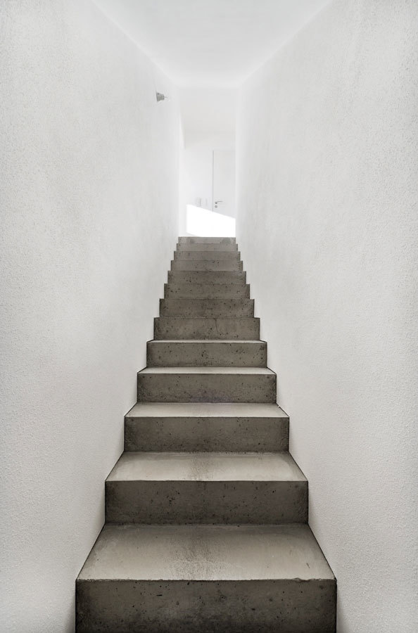 Jede Wohnung hat einen eigenen Zugang von der Kempter Straße und erstreckt sich über vier Geschosse, vom Erdgeschoss bis unter das Dach. Durch die Anordnung gegenläufiger Treppen in Gebäudemitte ist es möglich beide Wohnungen über eine Erschließungszone an die öffentliche Kemptnerstraße und den privaten Gartenhof im Westen anzubinden.