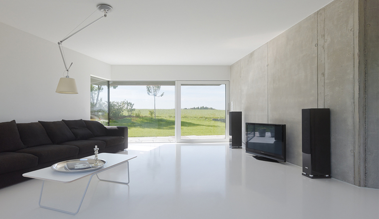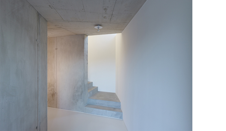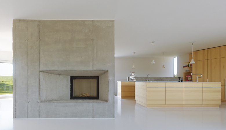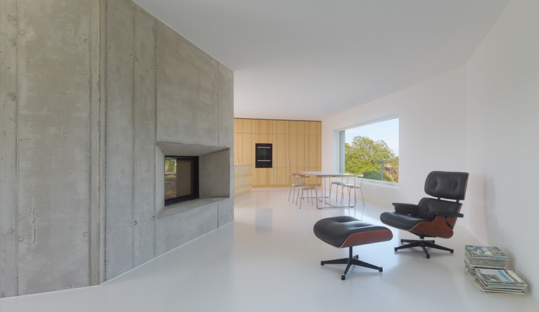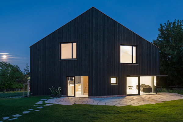 Die Höhenlage des Grundstücks am Rand der kleinen Gemeinde südlich von Landsberg ermöglicht nach Süden den Blick in die Alpen nach Norden den Blick ins Lechtal. Durch die Anordnung von Garage und Wohnhaus wurde der ursprüngliche Zustand des Hanggeländes zugunsten eines größeren Gartens kaum verändert. Der Zugangsweg überwindet entlang der Garage den Höhenunterschied und mündet in einem geschützten Kieshof. Hier befindet sich der Hauseingang und der Zugang zum Büro: eine Abkürzung führt über einige Stufen direkt in den Garten. Im nächsten Geschoss befindet sich die Wohnebene, die nach Süden über große Öffnungen den Blick übers Dorf in die Berge freigibt und nach Norden ebenerdig mit dem Garten verbunden ist. Über eine schmale Holztreppe gelangt man in die privaten Zimmer unterm Dach. Eine in Farbigkeit und Ausführung regional typische Fassadenschalung stellt einen stimmigen Ortsbezug her.