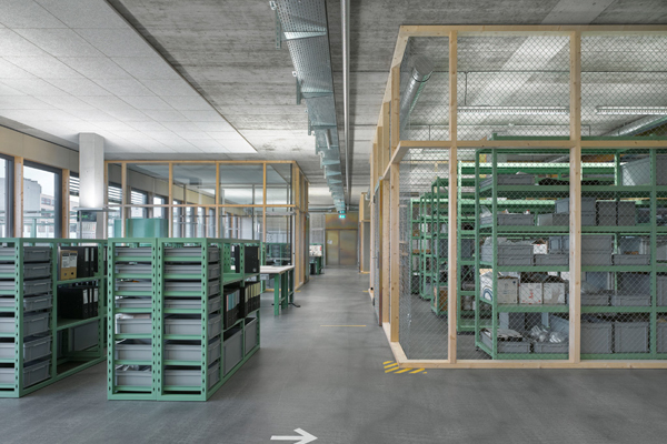 Depending on the rooms’ function, the wooden frames are covered on one side with glass (individual offices), cement-bonded chipboard (meeting rooms) or diagonal metal mesh (storage areas). The entrances on each level are colourfully and functionally arranged with recreation areas (biopoints) and printer zones.