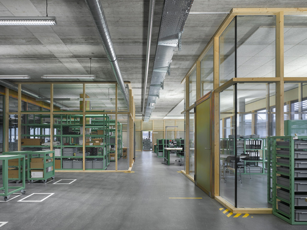 The cutting stations and the control and logistics centres are located in the high main hall. A mezzanine level containing offices has been superimposed in this large space. The development and administration offices are located on the upper floors with the roof canteen and a factory shop. Simple timber-frame fixtures divide the large unfinished space and give it a sense of spatial tension.