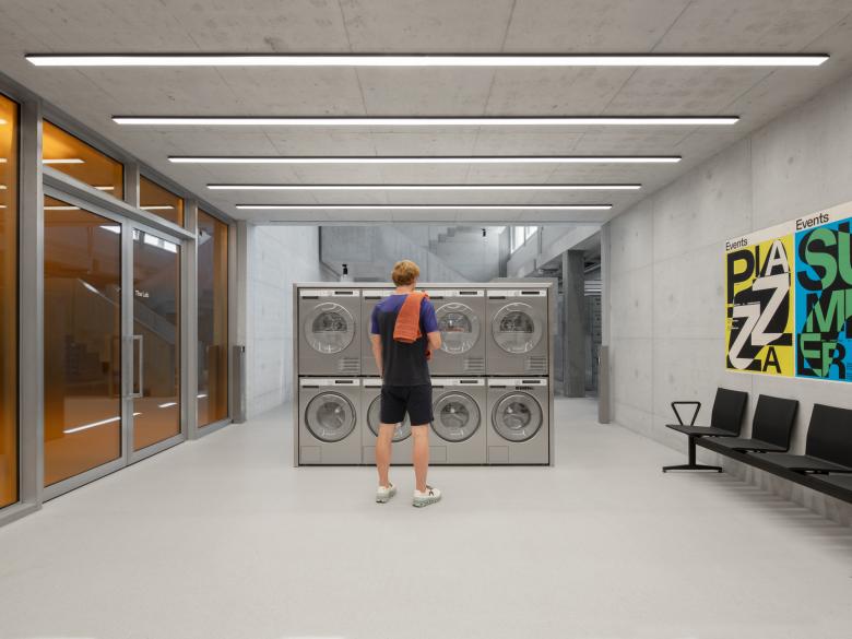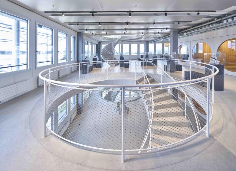 A reception area with an integrated café and shop is located on the ground floor. One floor up, a generous two-storey space for meeting and co-working is open to external visitors, thus establishing a connection to the surrounding city.