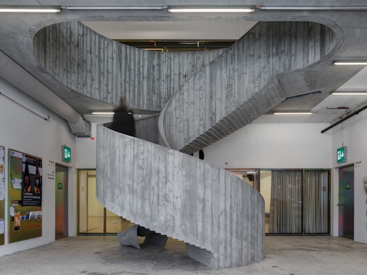 The large-format glass partition walls allow generous light distribution deep into the building core. The spiral exposed concrete staircase connects the wide entrance area with the floors below. The careful, reduced choice of materials produces a spatial atmosphere with an industrial feel: concrete, glass and yellow chromatised steel, together with acoustic sprayed plaster ceilings and textile ventilation ducts subtly complement each other. The dance school was expanded in 2019 with an enlarged cloakroom and four more dance studios matching the new design aesthetic.