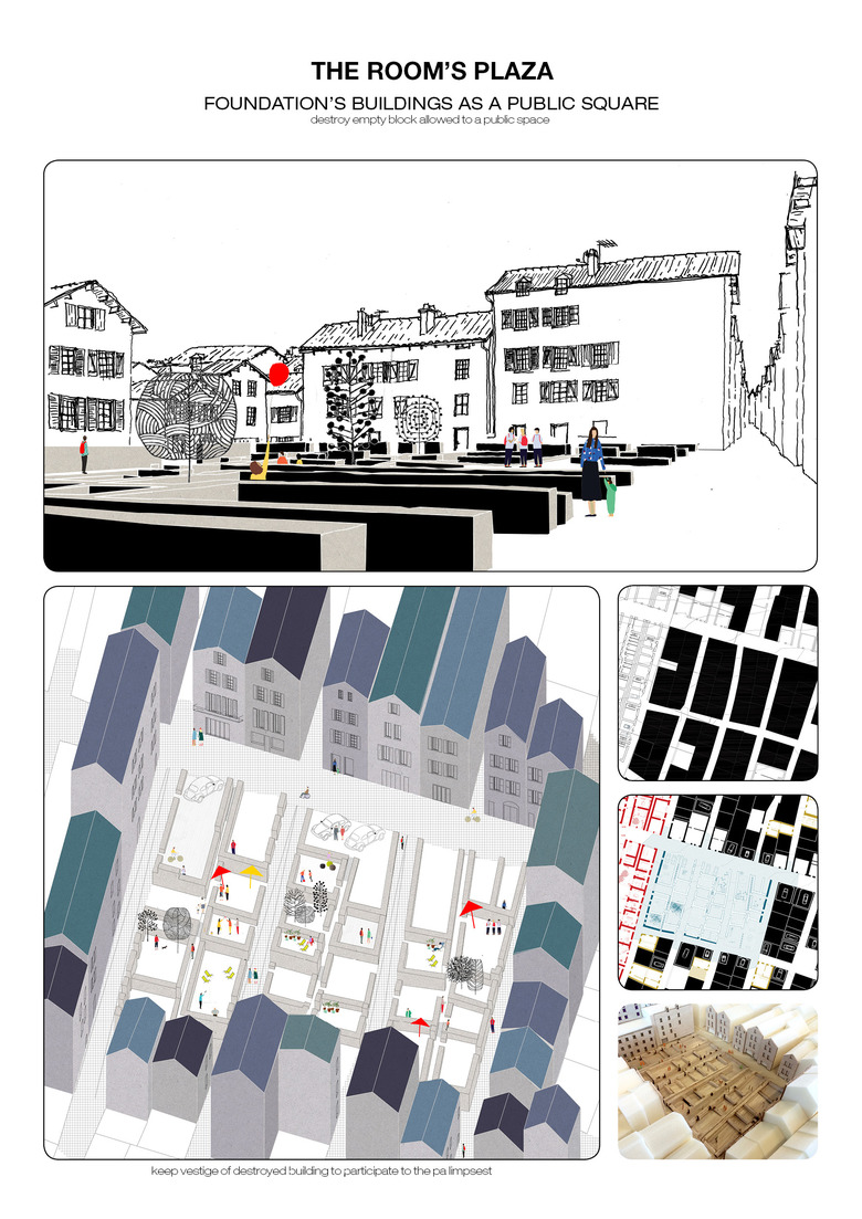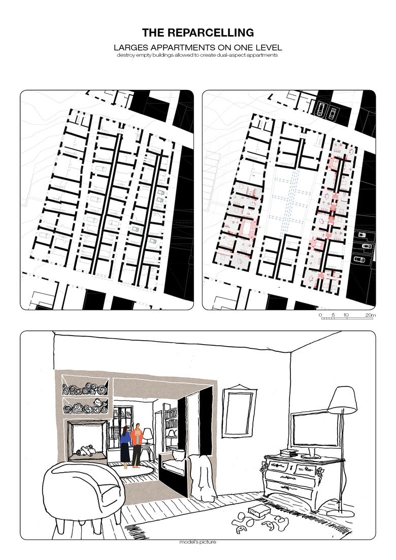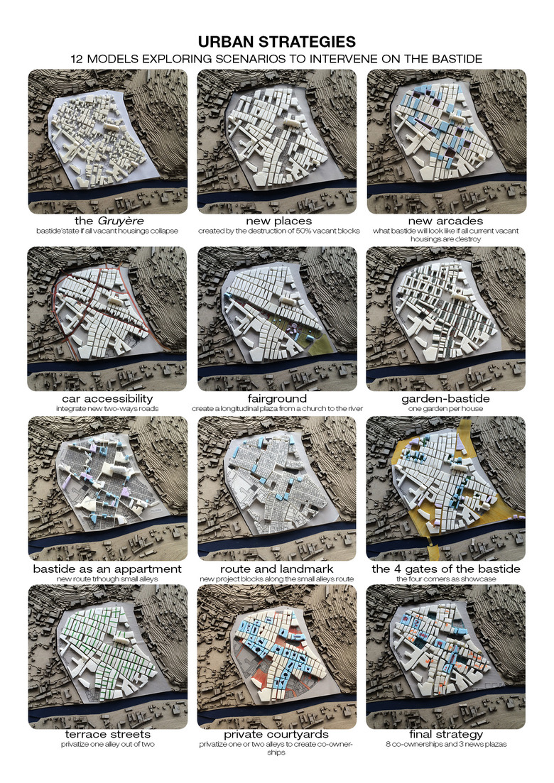 The societal importance of town center desertion orientates our project to be coherent with this topic’s expectations. Solving this problem will need tens of years and is going to be crucial in our future profession. Further people’s decisions will change the way we live in cities. We believe student’s works must participate to public debates : it’s fundamental to consider uninhibited ideas as a contribution to highlight possibilities and contradictions of the current urban fabric system. We thus designed this project as operational propositions. The town council of Villefranche-de-Rouergue, which just starts procedures to stop its center’s desertion, took our project as a base for further reflections on the mutation of the bastide.
