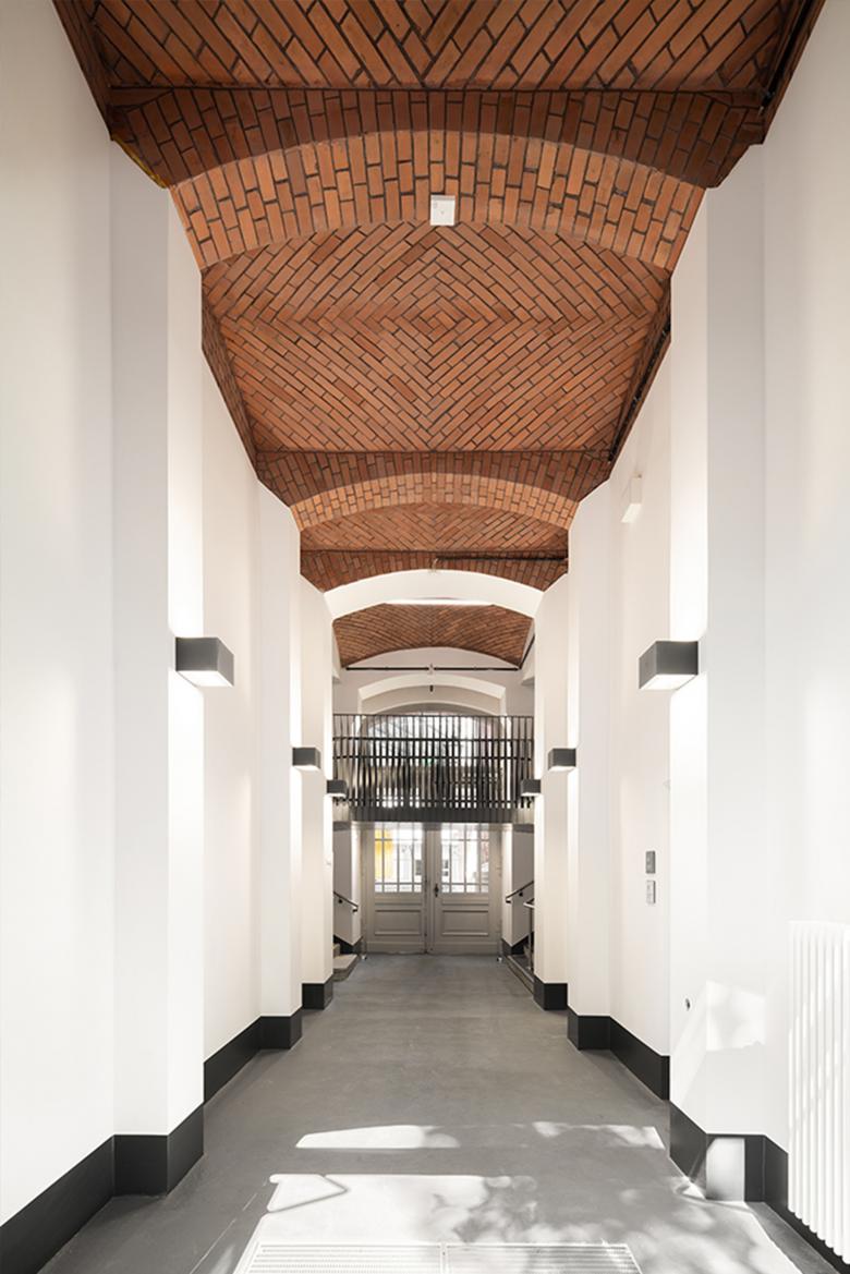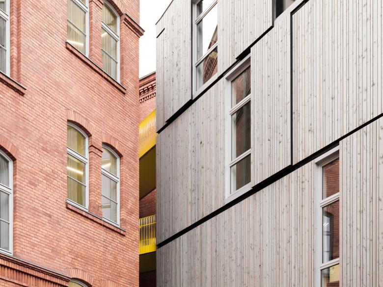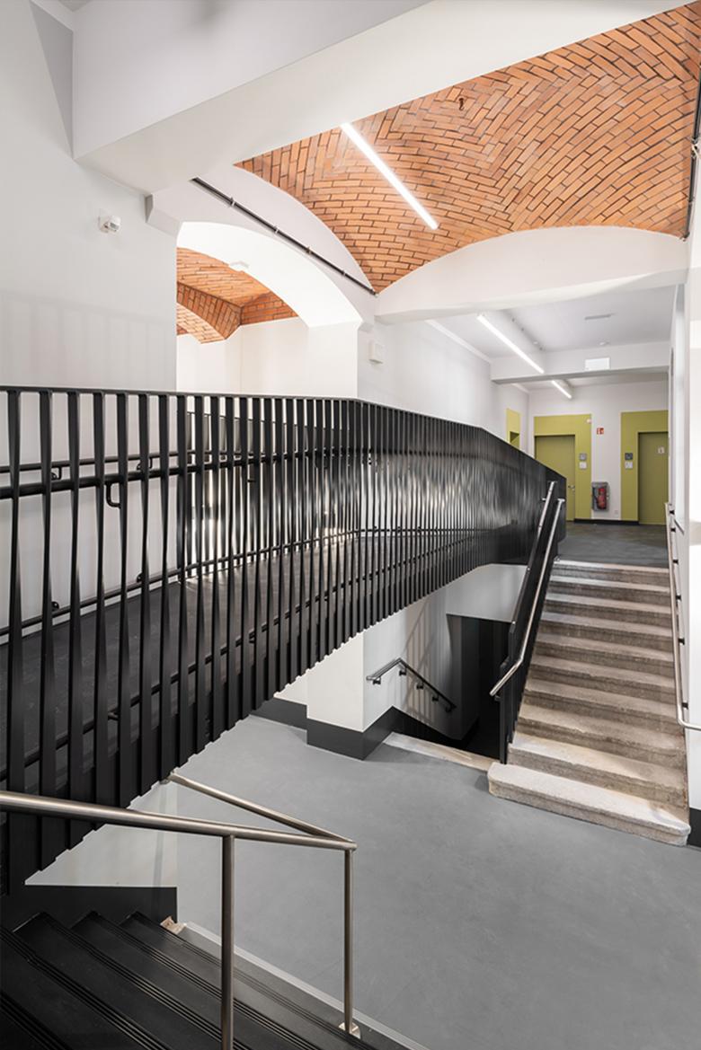 Modernisierung und Instandsetzung sowie Erweiterung der Robert-Koch-Oberschule, finanziert im Rahmen des Förderprogramms “Lebendige Zentren und Quartiere” (ehemals „Städtebaulicher Denkmalschutz“). Die Maßnahme umfasst eine Optimierung der Grundrissstruktur, die Neuausstattung aller Naturwissenschafts-Räume, die denkmalgerechte Sanierung der Dachflächen, Erneuerung aller technischen Anlagen und Ertüchtigung des Brandschutzes. Ferner die Herstellung der Barrierefreiheit sowie die Realisierung eines neuen zeitgemäßen Innenraumkonzepts. Das, im Rahmen des Möglichen auf eine zukunftsweisende Schulpädagogik hin entwickelte Brandschutzkonzept, ermöglicht die Möblierung der breiten Flurzonen und somit die Erweiterung der bisherigen Nutzflächen zu Lern- und Arbeitszwecken. Auf der Hofseite ist ein 3-geschossiger, aufgeständerter Erweiterungsbau entstanden, welcher vom historischen Gebäude abgerückt und mit offenen Stegen mit diesem verbunden wird. Dieser, in zeitgemäßer Formensprache und mit einer Holzfassade bekleidete Baukörper, beherbergt Sonderräume der Schule sowie den zur barrierefreien Erschließung des Bestandsgebäudes erforderlichen Aufzug. Plastizität erhält der Baukörper durch außen liegende bewegliche Schiebeelemente, die vor der Fassadenbekleidung verlaufen. Die manuell zu bewegenden Holzelemente dienen sowohl als Blendschutz und Sonnenschutz.