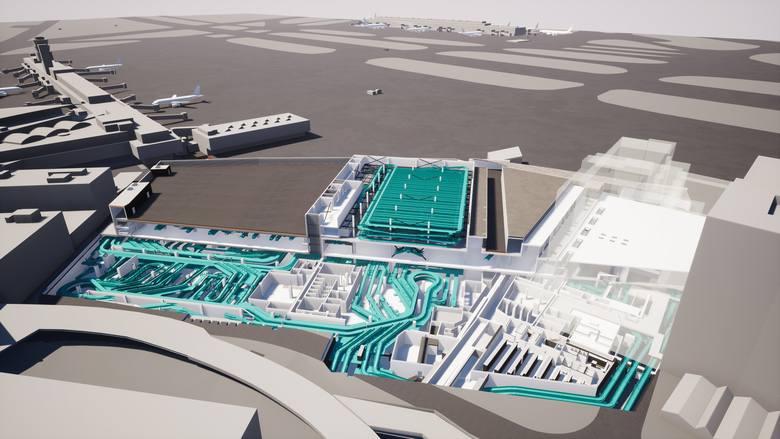 Es ist kompliziert. Echt kompliziert. Das fängt mit dem Namen Gepäcksortieranlage (kurz GSA) an. Satte 50'000 Quadratmeter ist die Anlage gross. Untergebracht in einem Sockelbau mit zwei Untergeschossen. Darauf kann man aufbauen, vielleicht später. Verbunden wird alles mit der bestehenden Anlage. Der Umbau und Ausbau erfolgt im laufenden Betrieb. Das Gebäude liegt prominent neben der Anfahrt zur Ankunft.