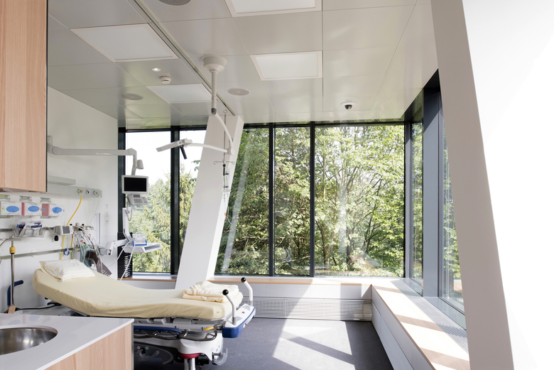 Das neue Zentrum für Notfall- und Intensivmedizin kommt voll zum Tragen. Von Anfang an musste Rechnung getragen werden, dass die Notfallzufahrt auch während des Baus in Betrieb blieb. Das viergeschossige Gebäude trägt es mit Fassung und stellt gleichzeitig sein Tragwerk zur Schau. Es trägt nicht dick auf, sondern verhüllt die Konstruktion hinter gläserner Horizontalität, die je nach Tageszeit, Wetter und Beleuchtung leicht spiegelt. Im Inneren war Flexibilität gefordert – die verschiedenen Nutzungen der Geschosse bedingten sehr unterschiedliche Grundrisse, bieten gleichzeitig Raum für modernste, lean-optimierte Spitaltechnik mit viel Übersicht und Aussicht für Patienten in schwierigen Situationen.