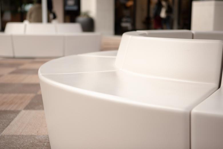 In the Mall Area, the walkways that connect the stores feature furniture that are designed to bring people closer to the greenery, and color scheme that compliment the greenery. This is so that visitors can always feel connected to nature while shopping. The entrance leading from the parking lot to the stores has an island resort-like atmosphere with an abundance of tropical plants such as coco palms and Taiwan crepe myrtles, further enhancing the feeling of excitement before shopping.