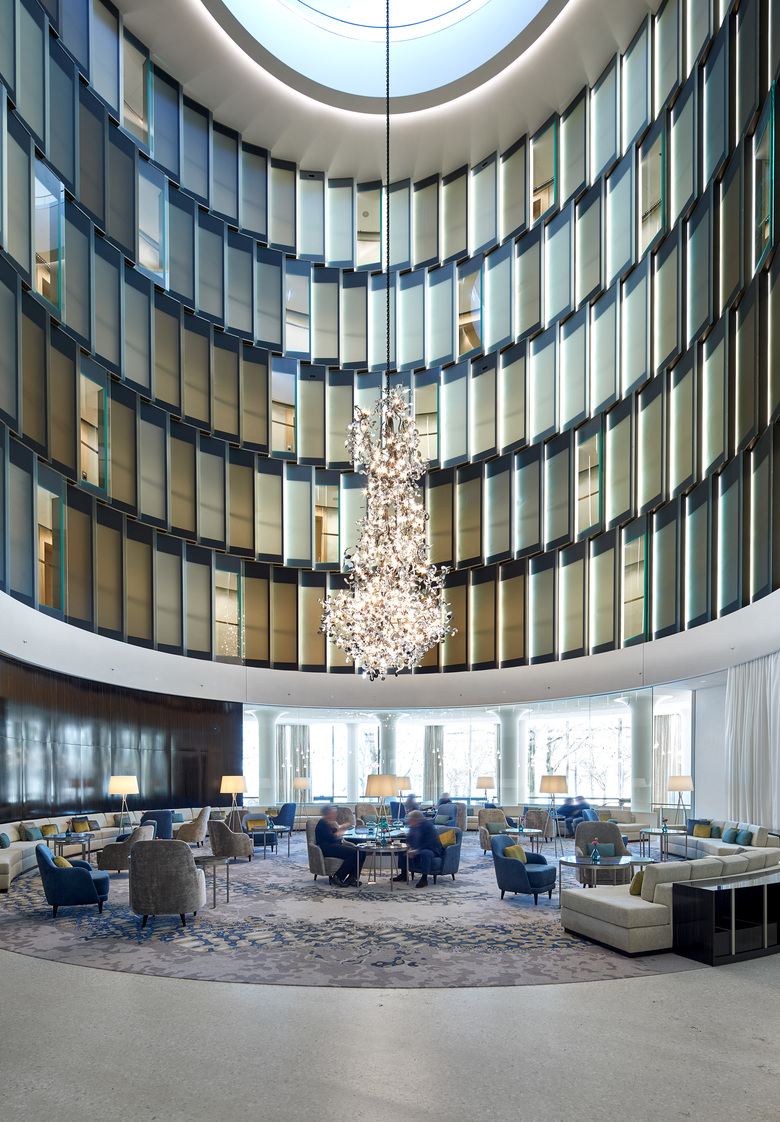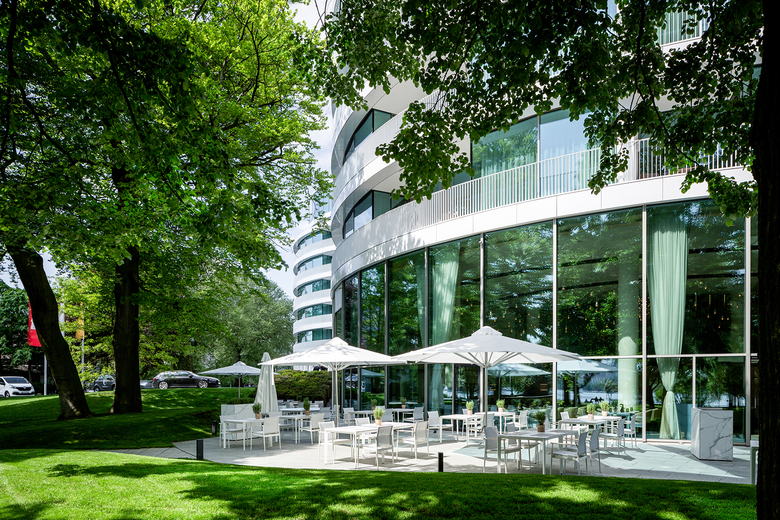 Drei verschliffene Kreise im Grundriss des Hotels lassen einen skulpturalen, achtgeschossigen Solitärbau entstehen, der eine besondere städtebauliche Kraft hat, und sich zugleich mit fließenden Linien harmonisch in das parkartige Gelände einfügt. Große Baumkronen schmiegen sich in die geschwungenen Fassaden. Sowohl aus dem Alster-Park als auch aus dem Innenraum heraus eröffnen sich mit jedem neuen Blickwinkel neue Perspektiven und Geometrien – die Gebäudefigur kennt keine Vorder- oder Rückseite. Die Fassade ist in elegante, horizontale Bänder aus Glasflächen und reflektierenden, großformatigen Keramikplatten gegliedert, die gemäß der Alsterverordnung in strahlendem Weiß aufgeführt sind. Durch zwei Höfe im Inneren des Baukörpers – ein gedecktes Atrium und ein offener Innenhof – entsteht ein lichtdurchflutetes Gebäude.