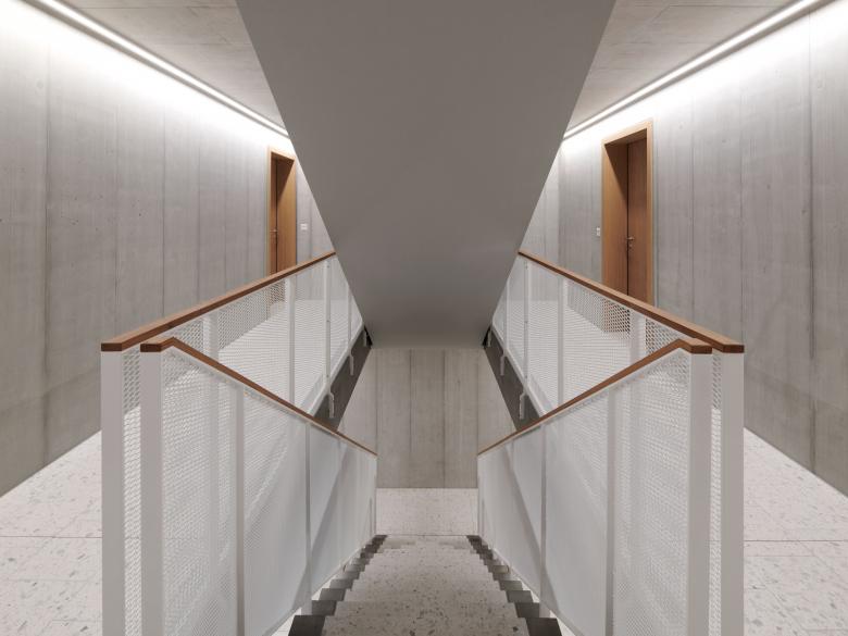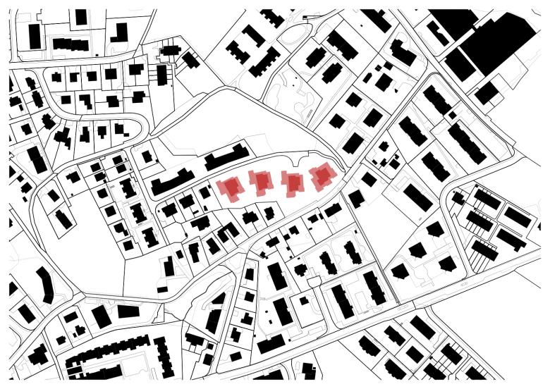 Die Wohnüberbauung liegt auf einer Hügelkuppe im Südosten der Gemeinde Gossau ZH. Vier kompakte Baukörper stehen leicht zueinander verdreht, wodurch das angrenzende Waldstück sichtbar bleibt und der Grünraum zwischen den Häusern in die Siedlung hineinfliessen kann. Die als Vierspänner konzipierten Häuser enthalten je rund zehn Eigentumswohnungen, wobei jede Wohnung über eine dreiseitige Orientierung verfügt. An den Süd gerichteten Gebäudeecken liegen grosszügige Balkone, flankiert von den Küchen und Wohnzimmern, die im Innern eine Übereck-Komposition bilden. Helle Betonbänder zeichnen die Geschossdecken nach und sorgen für eine horizontale Struktur.