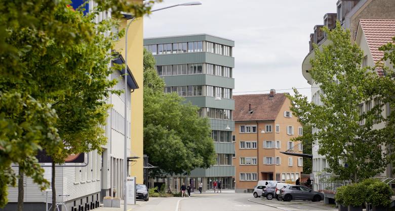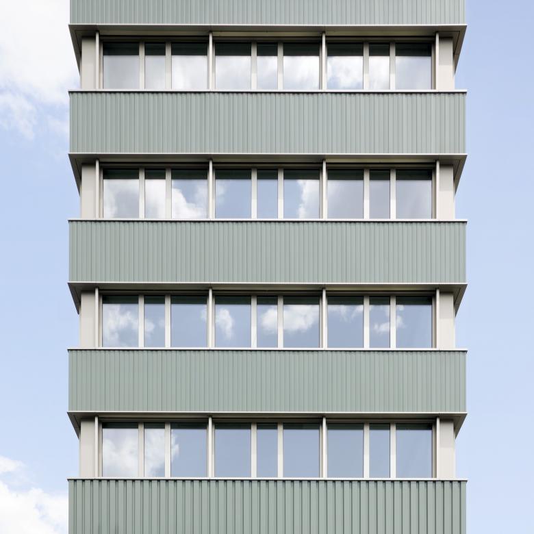 «B2Binz» prägt den Auftakt zum Gewerbegebiet Binz im Süden der Stadt Zürich. Der lange Baukörper erstreckt sich vom Bahnhof im Norden bis an die Grubenstrasse im Süden, wo die schmale Stirnfassade in die Höhe ragt. Lange Bandfenster laufen rund um das Gebäude und betonen im Wechseltakt mit den blechverkleideten Brüstungen die Horizontale. Die abgetreppte Ostfassade vermittelt zwischen den grossmassstäblichen Gewerbebauten im Westen und der angrenzenden Wohnsiedlung. Gleichzeitig generieren die vorgelagerten Volumen attraktive Terrassen für die ab dem vierten Obergeschoss angesiedelten Dienstleistungsbetriebe. Die unteren Geschosse sind dem produzierenden Gewerbe vorbehalten.