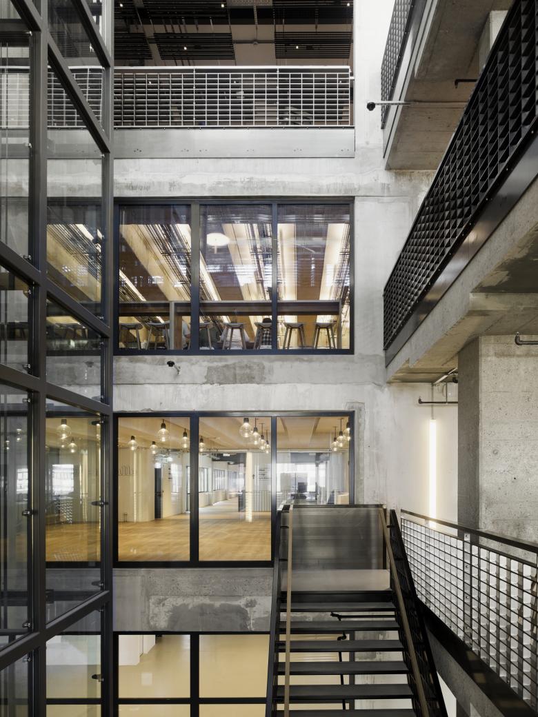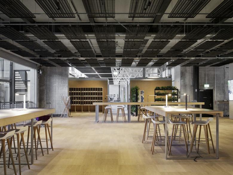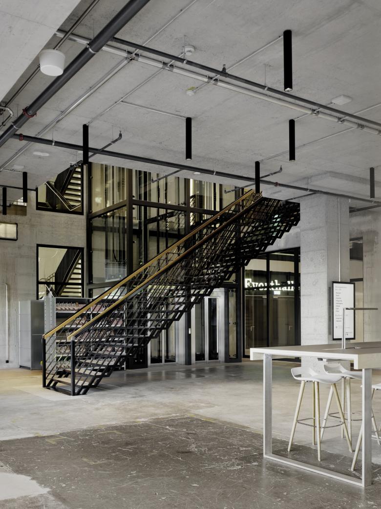 Auf dem ehemaligen Areal des NZZ Druckzentrums befindet sich der neue Business-Hub JED. Die Räumlichkeiten der Firma Halter nehmen Teile der umgebauten Druckerei ein. Den Auftakt bilden die Co-Working-Arbeitsplätze im Erdgeschoss. Eine Stahltreppe zieht die Blicke auf sich und führt zu den Sitzungszimmern im ersten Obergeschoss. Die meisten Arbeitsplätze befinden sich im aufgestockten dritten Obergeschoss. Dieses besteht aus einem kreuzförmigen Grundriss, dessen Mitte zum Treffpunkt wird. In den angrenzenden Bürobereichen bieten massgeschneiderte Boxen Rückzugsorte für Telefonate und Sitzungen. Wie kleine Häuser wirken sie in der grossen Halle und machen daraus einen städtisch anmutenden Ort.